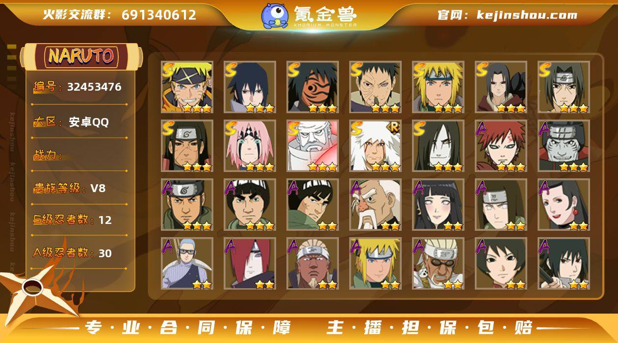 实名: 可修改 贵族等级: V8 S忍数: 12 A忍数: 30 亮点: 【HY745】12S级忍者数-30A级忍者数【S级忍者】:千手柱间「秽土转生」(3星),宇智波鼬「秽土转生」(3星),春野樱「忍界大战」(3星),宇智波带土「忍界大战」(3星),宇智波鼬「须佐能乎」(3星),自来也「舞之豪杰」(3星),大蛇丸(3星),波风水门(3星),神秘面具男「红夜之刃」(3星),宇智波佐助「永恒万花筒」(3星),大筒木金式(3星),漩涡鸣人·宇智波佐助(3星)【A级忍者】:艾「青年」(2星),长门「青年」(2星),波风水门「青年」(2星),迪达拉(2星),迪达拉「秽土转生」(2星),奇拉比「忍界大战」(2星),飞段(2星),飞段「死司凭血」(2星),干柿鬼鲛(3星),漩涡鸣人「仙人模式」(2星),迈特凯(3星),旗木卡卡西「忍界大战」(2星),我爱罗「疾风传」(3星),蝎(2星),小南「神驹佑将」(2星),猿飞阿斯玛(3星),宇智波鼬(2星),宇智波佐助「须佐能乎」(2星),宇智波佐助「万花筒写轮眼」(2星),照美冥「五代目水影」(2星),日向宁次「忍界大战」(2星),日向雏田「最终章」(2星),长十郎「六代目水影」(2星),猿飞木叶丸「博人传」(2星),黑土「博人传」(2星),秋道丁次「忍界大战」(2星),千代「近松十人卫」(2星),不缘(2...