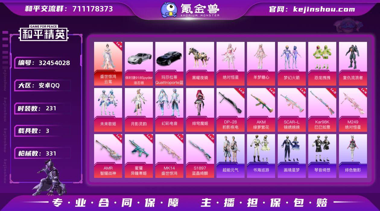安卓 手Q-1神装-10粉装-12特效枪-3载具-11粉色飞行器-103040热力值-21王牌印记-231套装-331枪皮 【红色神装等级】:盛世惊鸿-云鸾(四级) 【红色角色神装】:盛世惊鸿-云鸾 【热门品类】:粉装-梦幻火箭,套装-浪漫天命,套装-龟仙人,套装-粉红小猪 【粉色套装】:角色-绝对恒星,粉装-梦幻火箭,粉装-恐龙拽拽,角色-复仇流浪者,粉装-未来歌姬,角色-月影灵韵,粉装-幻彩电音,角色-绯穹魔姬,角色-羊梦糖心,角色-霁蓝缠春 【粉色枪皮等级】:AKM-绿萝繁花(五级),SCAR-L-锦绣绵绵(五级),蜜獾-异瞳寒姬(三级),Kar98K-巳巳如意(五级),Mk14-盛世惊鸿(三级),Mk14-福马献瑞(五级),AMR-智耀战神(四级),S1897-蓝晶绮麟(二级),AA12-G-萌骑幻想(二级),M249-绝对恒星(四级),M249-霁蓝缠春(一级),DP-28-豹影疾电(五级) 【粉色载具】:玛莎拉蒂Quattroporte(夜幕蓝),保时捷918 Spyder(液态银),黑曜夜骑 【粉色枪皮】:AKM-绿萝繁花,SCAR-L-锦绣绵绵,蜜獾-异瞳寒姬,Kar98K-巳巳如意,Mk14-盛世惊鸿,Mk14-福马献瑞,AMR-智耀战神,S1897-蓝晶绮麟,AA12-G-萌骑幻想,M249-绝对恒星,M249-霁蓝缠春,DP-28-豹影疾电 【粉色飞行器】:酣梦熊熊飞行器,绝对恒星飞行器...