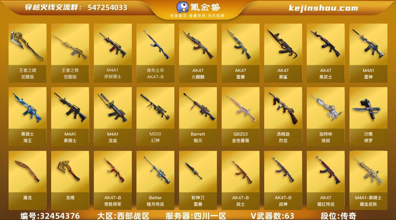 四川一区-67V-2王者武器数-0炫金武器数 【热门武器】:QBZ03-金色蔷薇,M200-幻神,M4A1-黑骑士,汤姆逊-烈龙*5,加特林-炼狱*2,斯泰尔-蝴蝶*2,USP-雷暴*2,沙鹰-修罗*3 【音效卡】:M200-幻神音效卡,M4A1-黑骑士音效卡,Barrett-毁灭音效卡 【皮肤】:M200-幻神-黄忠皮肤*2,雷神-耀金皮肤*2,雷神-宠儿-2019MVP,火麒麟-雷神,毁灭耀金皮肤,黑骑士耀金皮肤,战神-粉色甜心皮肤,战神-紫绶金章皮肤,战神-流金岁月皮肤,AK47-B-常胜将军-孙权,修罗-能量核心 【角色】:春,零·纪元,战地猎狐,王者-魅影,王者玲珑-小乔,乔伊教练,初恋灵狐,风暴女,嘉年华灵狐,灵狐者-黄金海岸,潘多拉-X,潜龙队-X,蜀雪,铁骑荣耀,王者-零-传说之路,雪莉杨,影武者-X 【人偶武器】:火麒麟-灵狐,斯泰尔-蝴蝶*2,AWM-灵狐-15周年嘉年华,COP-旗袍,迷你裂空之翼,闪光弹-小乔*2,闪光弹-貂蝉,高爆手雷-大乔 【暴走生化】:超级对讲机 【挑战大师】:神圣爆裂者-末日III 【英雄级武器】:AK47-火麒麟,M4A1-雷神,M4A1-黑骑士,AK47-黑武士,AK47-黑鲨*3,M4A1-龙血*3,AK47-雷暴,QBZ03-金色蔷薇,王者之势-觉醒版,AK-47-猩红传说,AK47-B-战神,黑骑士-海王,AK47-B-常胜将军...