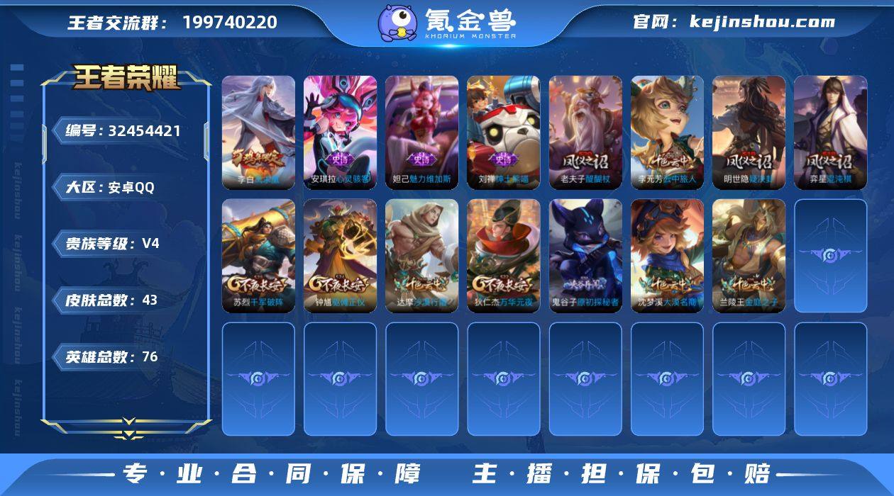 JJ4253:安卓Q-V4-秩序白银I-76英雄-43皮肤1传说-4史诗-游戏信誉分81 凤求凰 【稀有英雄】 不知火舞 橘右京 娜可露露 韩信 赵云 【传说皮肤】 凤求凰 【限定皮肤】 凤求凰 【史诗皮肤】 魅力维加斯 李小龙 心灵骇客 绅士熊喵 【勇者皮肤】 沙漠行僧 大漠名商 大发明家 丁香结 醍醐杖 黑桃队长 阴阳师 海滩派对 完美运算 万华元夜 原初探秘者 疑决卦 阿尔法小队 死亡骑士 玩偶对对碰 掌控之力 忍·炎影 兔女郎 金庭之子 千军破阵 万象初新 云中旅人 少女阿狸 混沌棋 驱傩正仪 【其他皮肤】 金属狂潮 龙域领主 花见巫女 绯红之刃 剑舞者 归虚梦演 西部大镖客 幸存者 绝影神枪 森 孤猎 赤焰之缨 露花倒影
