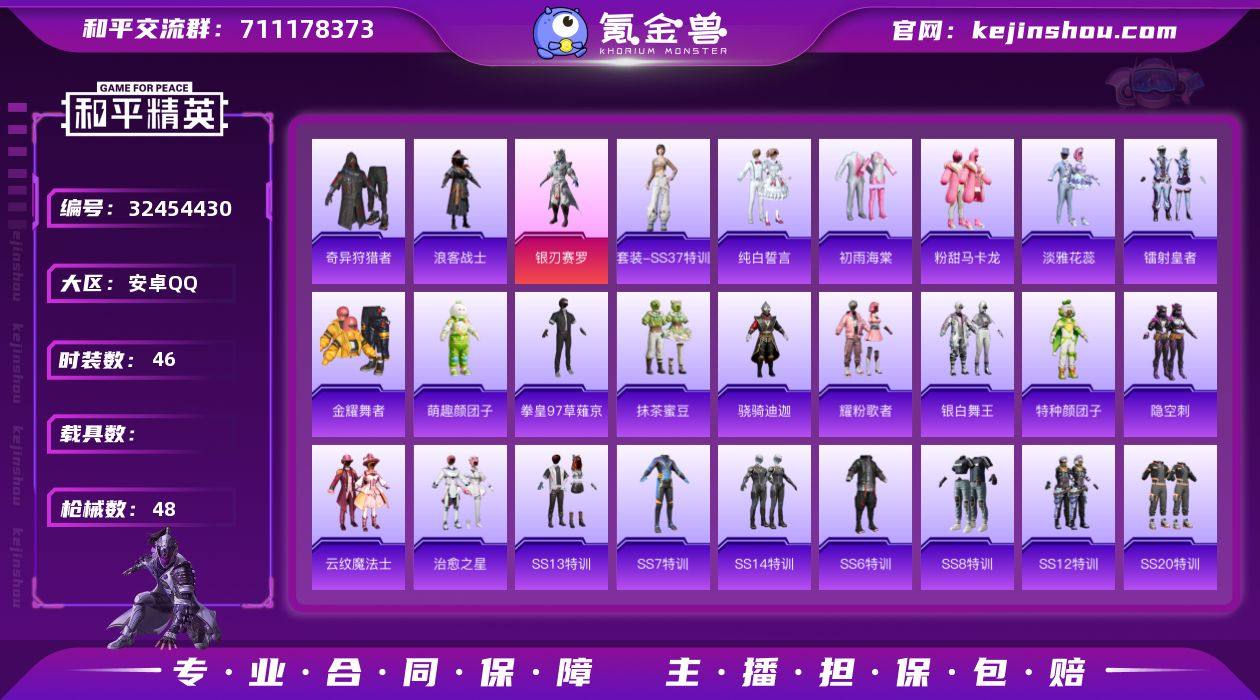【kyhp770】安卓 手Q-0粉装-6特效枪-0载具-0粉色飞行器-20452热力值-2王牌印记-43套装-85枪皮 【热门品类】:套装-都市猎人,套装-忍者信条 【粉色枪皮等级】:ACE32-萌骑漫游(四级),UMP45-萌骑冒险(一级),AKS-74U-森灵之息(五级),Kar98K-巳巳如意(三级),Mk14-福马献瑞(五级),DP-28-豹影疾电(五级) 【粉色枪皮】:ACE32-萌骑漫游,UMP45-萌骑冒险,AKS-74U-森灵之息,Kar98K-巳巳如意,Mk14-福马献瑞,DP-28-豹影疾电 【粉色降落伞】:幻影战神降落伞,圣堂之誓降落伞,精灵梦叶罗丽降落伞 【稀有套装】:套装-马上有钱,套装-雏菊兔兔,套装-萝兰蝴蝶,套装-糖糖葫芦,套装-青团波波,角色-都市丽猫,套装-朱霞炽焰,套装-凌霄紫焰,套装-雨过天青,套装-红釉青花 【稀有枪皮】:AKM-影袭,M16A4-幻世战舞者,M16A4-千金淑猫,SCAR-L-夜灯,SCAR-L-炫彩节奏,M416-蓝色火焰,GROZA-影袭,AUG-幻影战神,AUG-耀粉歌者,M762-天降萌叽,ARX-凌霄紫焰,UZI-啾咪啾咪,UZI-影袭,UMP45-夜灯,UMP45-绒宝小鹅,汤姆逊-耀粉歌者,JS9-凌霄紫焰,Kar98K-影袭,M24-影袭,M24-奇异狩猎者,SKS-炫彩节奏,Mini14-耀粉歌者,S686-彩虹符号,S686-千金淑猫,S12K-夜灯,MG3-幻世战舞者,MG-36-凌霄紫焰,P92-凌霄紫焰,平底锅-凌霄紫焰 【其他套装】:套装-SS29特训,套装-夏日倾情,套装-特殊使命,套装-疯狂小兔子,套装-破蛋小黄鸡,套装-红色运动,套装-缤纷果语,套装-蓝色运动,套装-街头潮人,套装-长空猛禽,套装-魅力单车,套装-鹤鸣,套装-鹰眼刺客,套装-冰冻风暴,套装-漫步者 【稀有头盔】:幻影战神头盔(3级),幻影战神头盔(1级),深海小丑鱼头盔(3级),金羽特工头盔(2级),金羽特工头盔(1级) 【稀有背包】:幻影战神背包(2级),深海小丑鱼背包(2级),金羽特工背包(3级),金羽特工背包(2级) 【营地ID】:...