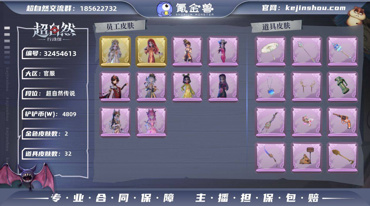金皮1;紫皮4;道具皮10;皮肤:巫铃儿-镜花辞,阿念-庆宴绮愿,小黄-呱呱雨衣,爱丽丝-丝缕哀歌,爱丽丝-耀眼的你;道具:急救包-蔷薇物语,闪光弹-金戈玄铜,转轮手枪-新星时代,腰包-红运福虎,喷气背包-乘风溯雪,电击枪-权杖的许诺,音响-鸣沙鼓,除颤仪-冰晶般的代价,长鞭-新春炸响,伞-伞;饰品:头饰-樱桃奶油布丁,头饰-蒜了八,头饰-大葱明头套,头饰-哈士奇头套,头饰-烛光纪念,头饰-雪墩墩头套,头饰-卑微头套,头饰-太空鲨头套,头饰-嘻嘻头套,头饰-滑稽头套,头饰-烈焰红唇头套,头饰-鱼头怪头套,头饰-火爆了头套,头饰-萨卡班甲鱼头套,头饰-饺饺者头套,头饰-炙热烧烤,头饰-呆滞头套,头饰-惊魂南瓜头套,头饰-面具马头套,头饰-像素朋克墨镜,头饰-后室幸存者头套,挂饰-九色祥鹿,挂饰-糖果守卫,挂饰-钗头凤,背饰-蝶恋花,背饰-牛啤背包,背饰-醉花阴;动作:动作-luvaboy,动作-不孬摇,动作-心跳摇,动作-青海摇,动作-舞台中心,动作-要糖,动作-举牌,动作-抬手;工牌背景:工牌背景-粉嫩小海狸,工牌背景-复活的肖像,工牌背景-佛系小豚,工牌背景-流金照庭;工牌动作:工牌动作-鸦影,工牌动作-轻躯鹤立;员工:逍遥,爱德华,爱丽丝,阿念,小满,零,巫铃儿,小黄,莉莉,薇薇安,艾伦,兰,临云;累充324元;铲铲币31.2万;金砖2;段位:超自然传说165;魔盒等级:80