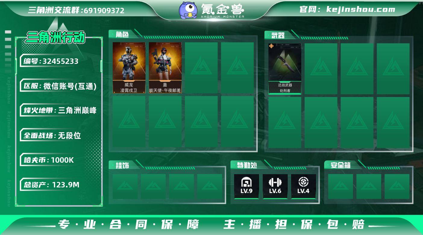 三角洲 微信可二次连体号 6红皮 巅峰8星 王者+王牌玲音悬浮摩托 描述 微信可二次实名,纯绿无违规,三游连体 主号:三角洲行动 6红皮全联动,处刑者橙刀,8典藏枪 总资产123.9M,仓库9级,巅峰8星 连体:王者荣耀 星耀IV,54英雄40皮肤,多限定,高胜率 连体:王牌战争 300+小时老号,15级基地 稀有红角色玲音 + 悬浮摩托 454皮肤,8红51金274紫 安全换绑,平台担保,诚心可小刀,屠龙刀勿扰