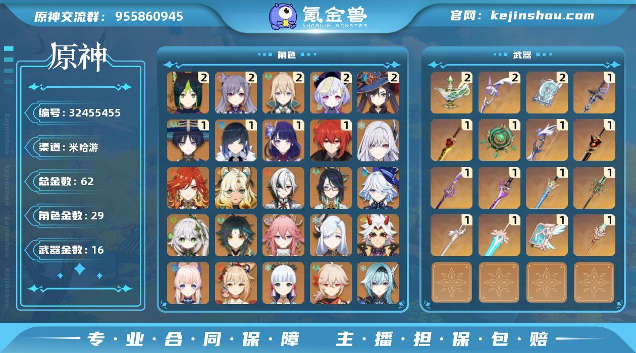 雷神夜兰1命带专武,草神甘雨万叶神里绫华魈都带专武,有火神仆人丝柯克芙宁娜希诺宁钟离申鹤心海闲云胡桃宵宫温迪优菈刻晴等很多热门角色,号里专武很多,角色都是关键命座,练度都很高,能组多支强势队伍,深渊随便打无压力,成品号入手就能玩,官方服人多热闹,具体情况看图,标价低要的直接下单,全天在线,随时能换绑,安卓苹果系统互通都能玩