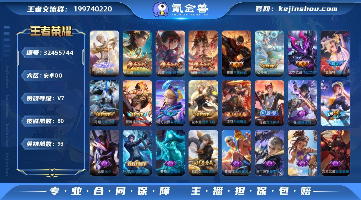【王者荣耀】珍品无双0 典藏0 无双1 珍品传说0 传说12 史诗21 英雄93 皮肤80 贵族7级 无双皮肤:无相__传说皮肤:无双飞将|地狱之眼|冠军飞将|浮生妄|妄想实况|祥瑞亨通|云诺千山|万灵伏威|花木兰-异界灵契|神骥·赴朔漠|神骥·越千峰|神骥·聚万邦__稀有限定:海滩派对|皇家上将|狂想玩偶喵|魔术师|无心|阴阳师|乘风破浪|鬼剑武藏|吕布-末日机甲|魅力维加斯|偶像歌手|鹰眼统帅|幽灵船长|星界特工|战舞者|海诺-心动手记|曙光守护者|飞车小橘子|狼魂孤将|刘禅-鸭鸭历险记|沈梦溪-鸭鸭历险记|龙之律动|布丁狗之约|虚灵犬护|逆浪荇歌|九幽镇关|小乔-线条小狗|周瑜-线条小狗__优质皮肤:埃及法老|激情绿茵|碧珀绯影|超能战警|海军大将|绯红之刃|启蛰|威尼斯狂欢|幸存者|前尘|龙域领主|花见巫女|异域舞娘|潮玩探月行|野性能量|坚韧之力|幻想奇妙夜|兔女郎|死亡骑士|天使之翼|忍·炎影|街头霸王|时空谍影|零食大作战|牛运亨通|时尚教父|白色死神|哥特玫瑰|魅影绮裳|龙腾万里|龙舞盛年|灵野札记|小满鸭|死霸装|极光幻客|溯影追猎|赤刃凌霄__贵族等级:贵族7级__王者段位:至圣王者【打野皮肤号】猴子无双皮肤【无相】+12传说皮肤【神骥·越千峰,异界灵契,冠军飞将,神骥·聚万邦,神骥·赴朔漠,...
