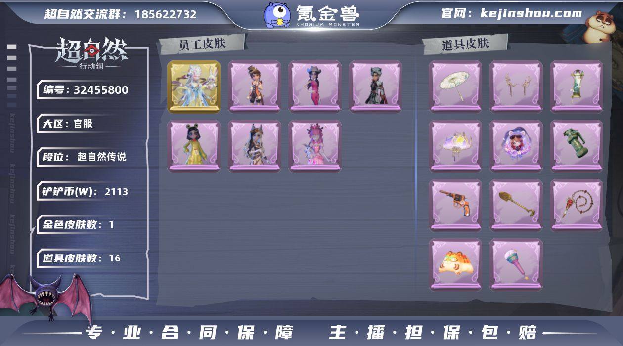 金皮1;紫皮10;道具皮11;皮肤:零-渡鸦公爵,小黄-异色序曲,爱丽丝-丝缕哀歌,莉莉-情公主,阿念-庆宴绮愿,爱丽丝-耀眼的你,爱丽丝-瑞羽衔春,小黄-呱呱雨衣,阿念-王子与骑士,薇薇安-白光莹,巫铃儿-素影瑶光;道具:转轮手枪-新星时代,闪光弹-金戈玄铜,刺刀-铂刺与红萼,音响-鸣沙鼓,摸金符-紫霄,专业手电-云端梦想计划,急救包-蔷薇物语,腰包-宝剑八,摸金符-花落精绝,长鞭-小狗蛇点点鞭,短管猎枪-星光的裁决;饰品:头饰-卑微头套,头饰-鱼头怪头套,头饰-火爆了头套,头饰-萨卡班甲鱼头套,头饰-滑稽头套,头饰-鳄霸天头套,头饰-大葱明头套,头饰-炙热烧烤,头饰-面具马头套,头饰-蒜了八,头饰-哈士奇头套,头饰-嘻嘻头套,头饰-小财神豚豚头套,头饰-小狗蛇点点头套,头饰-烈焰红唇头套,头饰-呆滞头套,头饰-驼半仙头套,头饰-烛光纪念,头饰-像素朋克墨镜,头饰-后室幸存者头套,挂饰-钗头凤,挂饰-九色祥鹿,挂饰-天使消失的年代,背饰-牛啤背包,背饰-云梦之星,背饰-毛球夹子;动作:动作-新年摇,动作-luvaboy,动作-舞台中心,动作-心跳摇,动作-sugar摇,动作-律动迪斯科,动作-抬手,动作-旋转舞,动作-举牌;工牌背景:工牌背景-珊瑚海,工牌背景-点点萌伴,工牌背景-冰晶宫,工牌背景-圣光之誓,工牌背景-雷霆轩,工牌背景-童话扉页,工牌背景-蓝海奇遇;工牌动作:工牌动作-元气剪刀手,工牌动作-轻躯鹤立,工牌动作-虔诚之姿;员工:临云,兰,逍遥,爱德华,零,小黄,艾伦,薇薇安,爱丽丝,小满,阿念,巫铃儿,莉莉;累充675元;铲铲币34.7万;金砖4;段位:超自然传说7;魔盒等级:1;