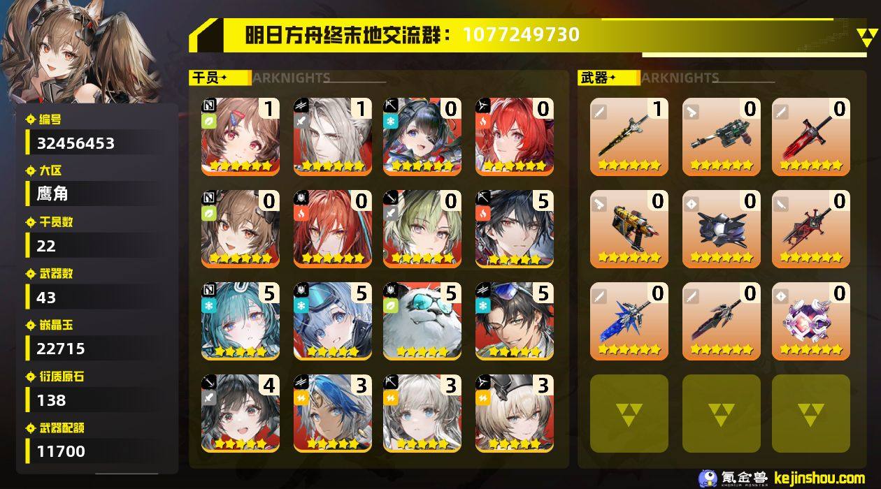 权限等阶56, 19橙(角色9, 武器10), 7个六星干员, 8把六星武器, 138个衍质源石, 21295个嵌晶玉, 协议定制18级, 武库配额11700
