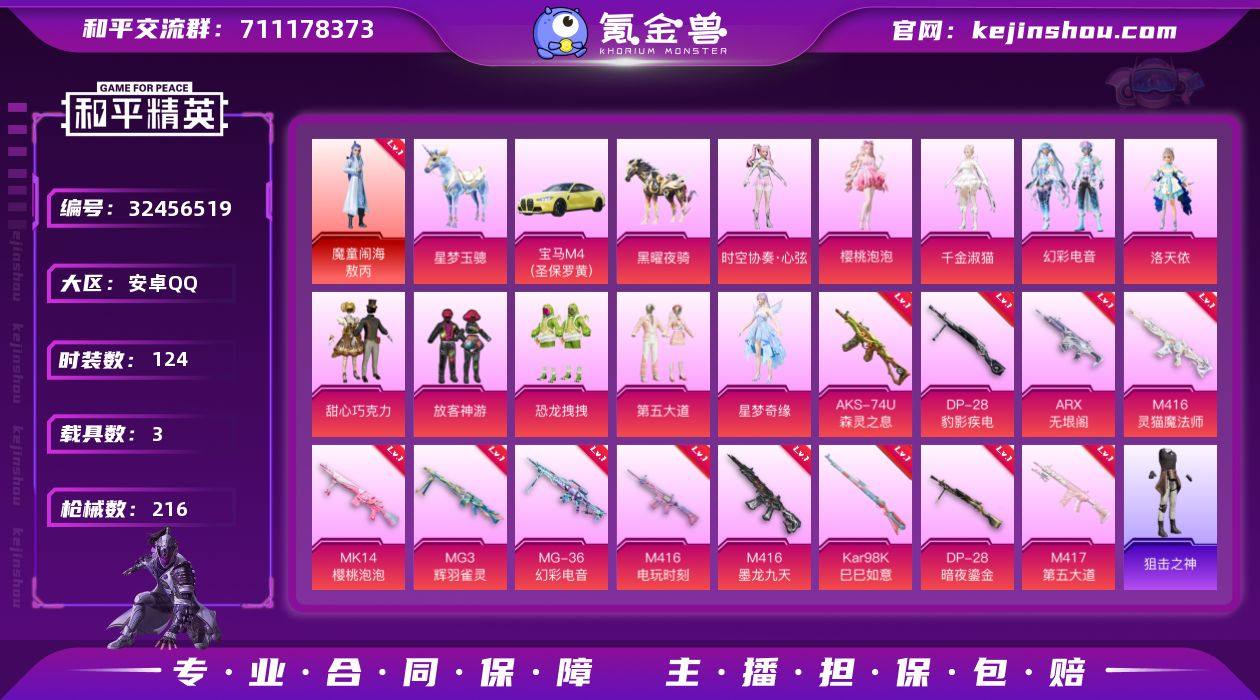 【2级敖丙14特效枪10粉装3载具LED眼罩 秒换绑不用等】 安卓Q区-68933热力值-124套装-216枪皮 【1红装】 魔童闹海-敖丙(2级)【3载具】 星梦玉骢 黑曜夜骑 宝马M4(圣保罗黄)【2稀有】 放客神游眼镜LED眼罩 Mark.06蓝螳螂【10粉装】 放客神游 甜心巧克力 洛天依 恐龙拽拽 第五大道 角色-樱桃泡泡 角色-星梦奇缘 时空协奏·心弦 幻彩电音 角色-千金淑猫【14特效枪】 M416-墨龙九天(3级) M416-灵猫魔法师(3级) MG3-辉羽雀灵(3级) AKS-74U-森灵之息(5级) Mk14-福马献瑞(5级) ACE32-萌骑漫游(2级) DP-28-暗夜鎏金(7级) M417-第五大道(7级) ARX-无垠阁(3级) Mk14-樱桃泡泡(1级) Kar98K-巳巳如意(5级) M416-电玩时刻(5级) DP-28-豹影疾电(5级) MG-36-幻彩电音(6级)【229热门】 大橘为重 纯白誓言 冰川格斗者 SS27特训 SS26特训 SS25特训 SS24特训 GROZA-恐龙拽拽 M762-天降萌叽 UMP45-蓝色火焰 AKM-霓虹街区 SCAR-L-甜蜜誓约 M416-蓝色火焰 M762-暗夜鎏金 M762-第五大道 破蛋小黄鸡 长空猛禽 青涩时光 霓虹街区 魅力单车 竞技达人朋克 坚韧舞者 海岛探路者 纯真浪花 春日漫步 爱崽白熊 S1897-糯团青竹 MK20-H-樱桃泡泡 AA12-G-雨过天青 M24-樱桃泡泡 沙漠之鹰-雨过天青 P90-霜月狼主 情...