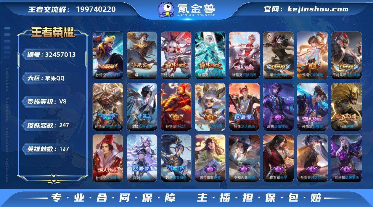 [17721041]V8 1典藏 16传说 127英雄 247皮肤 可修改实名 男号 【英雄全皮】蚩奼全皮,猪八戒全皮,影全皮,大禹全皮 【稀有英雄】大司命,嬴政(始皇帝),韩信(韩跳跳),夏洛特(夏师傅),艾琳,橘右京(橘子),娜可露露(鸟人),不知火舞,赵云,金蝉(唐僧),戈娅 【荣耀水晶】全息碎影(猴子典藏) 【传说皮】幻光神枪,神树通天,李逍遥,零号·赤焰,地狱火,云霓雀翎,久胜战神,云鹰飞将(小将军),飞鸢探春 【珍宝阁皮】妄想食味,优雅恋人,蔷薇恋人,玩趣恶龙 【赛季/战令皮】古海寻踪(s33),海盐诗旅(s30),擒涛扼浪(s31),探海日志(s32),剑破天穹(s35),天穹祈灯(s34),天穹之誓(s36),混沌棋(s18),疑决卦(s19),醍醐杖(s20),原初探秘者(s21),万华元夜(s22),演武夺筹(s23),驱傩正仪(s24),千军破阵(s25),蓝屏警告,夺宝奇兵,迷踪丽影,西部大镖客-猪八戒,暗影游猎(游乐娃子),潮玩骑士王,云间偶戏,星际陆战队-达摩,胡桃异想国,圣弓游侠,真爱魔法,火炮绅士,沙漠行僧(s26),幻夜卜梦,金庭之子(s27),大漠名商(s28),云中旅人(s29) 【史诗皮】化蝶舞,线条小狗-周瑜,灵蛊蚀心,龙之律动,百相守梦-黄忠,紫霞仙子,白龙吟,黄金分割率,特工魅影,千年之狐,永昼,江河有灵,偶像歌手,晚萤,龙骑士(小龙虾),魅语,电玩·爆裂旋风,...