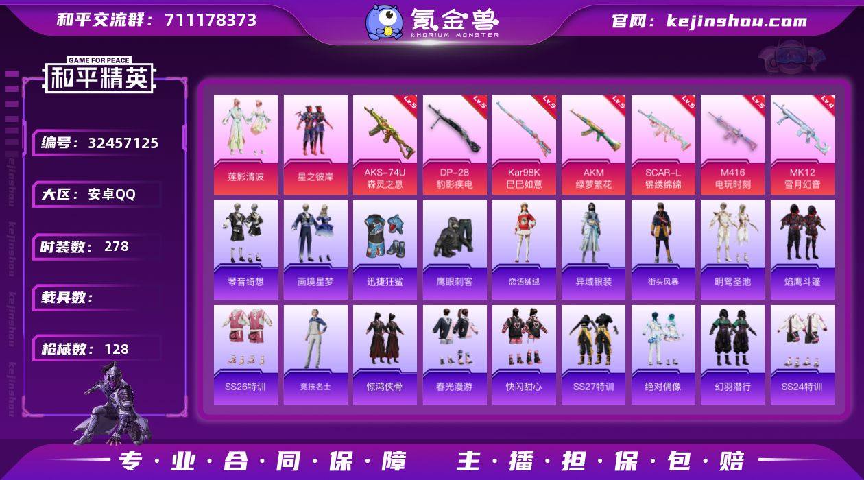 【特价出售】安卓Q-2粉装10特效枪3热门61套装128枪皮 35331热力值 1印记 历史卓越王牌13星 【2粉装】 莲影清波 星之彼岸 【10特效枪】 SCAR-L-锦绣绵绵 (5级) M416-电玩时刻 (5级) AKS-74U-森灵之息 (5级) AKM-绿萝繁花 (5级) Kar98K-巳巳如意 (5级) DP-28-豹影疾电 (5级) MK12-雪月幻音 (4级) AKS-74U-森灵之息 (5级) Mk14-福马献瑞 (4级) ACE32-萌骑漫游 (2级) 【3热门】 龟仙人 鹰眼刺客 迅捷狂鲨 【2背包】 幻影战神背包 放客神游背包