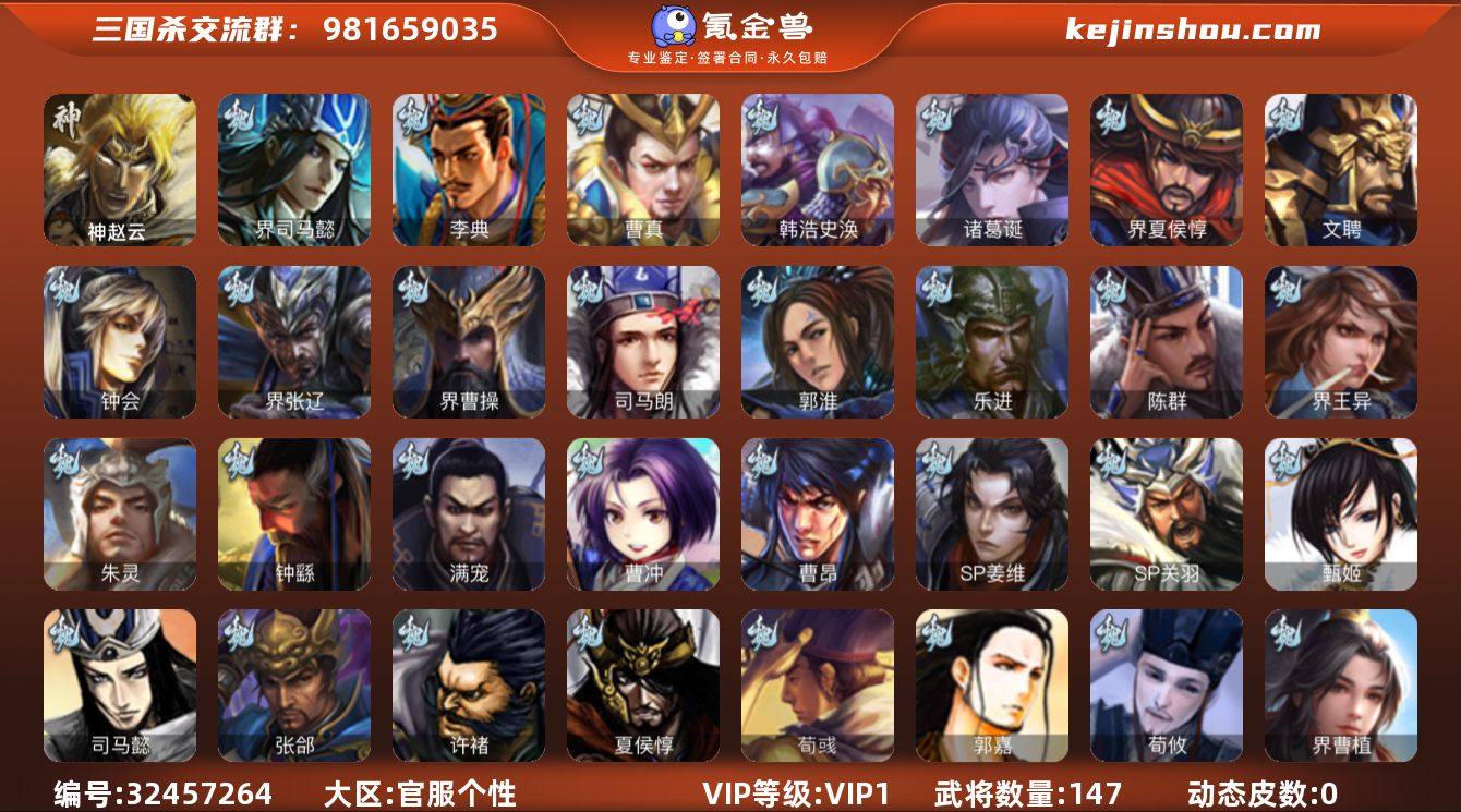 先锋将军,7100将魂,7.6万羽毛,带皮谋关羽,神赵云双史诗,谋韩当,界吕布,界孙休,界朱治,界刘表,濮阳兴,彭恙,张翼,界曹植,界简雍,孙翊,贾充,刘琦,马日磾,王濬147将,国战55将,6.5万豆,满级活树
