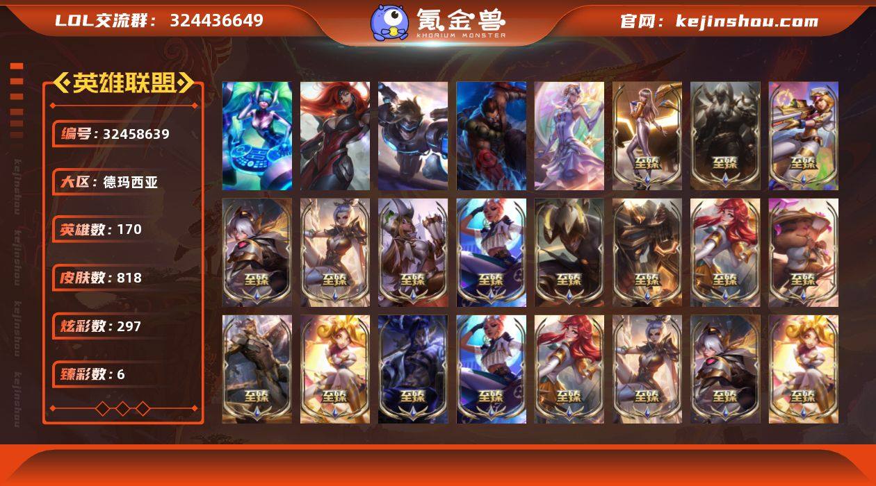 黄金段位-172英雄-720皮肤-334炫彩-3终极-41神话-97限定-86传说-158史诗 【海克斯皮肤】:新创战纪希维尔,海克斯科技斯维因,海克斯科技雷克顿,摄魂使者薇恩 【勇士皮肤】:拆弹专家黑默丁格,创意工坊黑默丁格,亮丽女神希维尔,烈焰猛士奥拉夫 【终极皮肤】:大元素使拉克丝,DJ娑娜,斗魂觉醒莎弥拉 【神话皮肤】:十周年纪念安妮,源代码乐芙兰,十五周年纪念希维尔,新卧虎藏龙贾克斯,暗星科加斯,神凰行者瑞羽圣凰艾尼维亚,黎明使者卡尔玛,海克斯科技雷克顿,海克斯科技斯维因,摄魂使者薇恩,新创战纪希维尔,至臻真实伤害赛娜,至臻真实伤害亚索,至臻至高天奎桑提,至臻北极星钢影卡蜜尔,至臻福牛守护者菲奥娜,至臻黑夜使者凯隐,至臻黑夜使者李青,至臻KDA阿卡丽,至臻KDAALLOUT卡莎,至臻灵魂莲华易,至臻魅惑女巫厄运小姐,至臻魅惑女巫厄运小姐2022,至臻魔女阿卡丽,至臻魔女乐芙兰,至臻女帝黛安娜,至臻绒毛菲兹,至臻绒毛菲兹2022,至臻神龙尊者炎龙瑟提,至臻太空律动魔音海妖娜美,至臻王国机神玄武盖伦,至臻腥红之月亚托克斯,至臻腥红之月亚托克斯2022,至臻星之守护者妮蔻,至臻星之守护者妮蔻2022,至臻星之守护者索拉卡,至臻心之钢永恩,至...