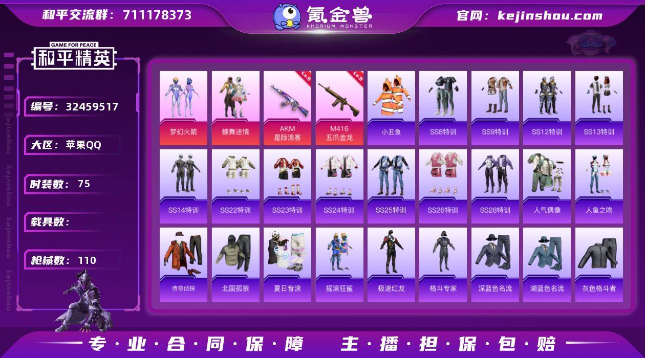 苹果 【素材号 粉装-梦幻火箭/小丑鱼/M416-五爪金龙(五级)/AKM-星际浪客(五级)】手Q-2粉装-2特效枪-0载具-1粉色飞行器-33694热力值-1王牌印记-75套装-110枪皮 【热门品类】:粉装-梦幻火箭,套装-小丑鱼 【粉色套装】:粉装-蝶舞迷情,粉装-梦幻火箭 【粉色枪皮等级】:AKM-星际浪客(五级),M416-五爪金龙(五级) 【粉色枪皮】:AKM-星际浪客,M416-五爪金龙 【粉色飞行器】:梦幻火箭飞行器 【粉色降落伞】:深海曼妙降落伞,至尊龙雀降落伞,梦幻火箭降落伞,马卡龙降落伞,夏日绵绵冰降落伞,香水柠檬降落伞,暗夜鎏金降落伞,炫彩糖果降落伞 【稀有枪皮】:AKM-四圣焕新,AKM-夜灯,M16A4-红色方程式,M16A4-蓝色火焰,SCAR-L-炫彩节奏,SCAR-L-红色方程式,M416-红色方程式,M416-蓝色火焰,GROZA-懵萌河马,GROZA-治愈之星,GROZA-田园牧歌,AUG-耀粉歌者,QBZ-原初圣火,QBZ-彩虹符号,QBZ-未来歌姬,QBZ-赛罗,M762-天降萌叽,M762-奇异狩猎者,M762-拳皇97,M762-暗夜鎏金,M762-深海曼妙,M762-牛气冲天,M762-镭射皇者,Mk47-妙红点点,G36C-懵萌河马,G36C-金风玉露,蜜獾-天降萌叽,UZI-红色方程式,UZI-魔法学院,UMP45-夜灯,UMP45-蓝色火焰,Vector-彩虹符号,...