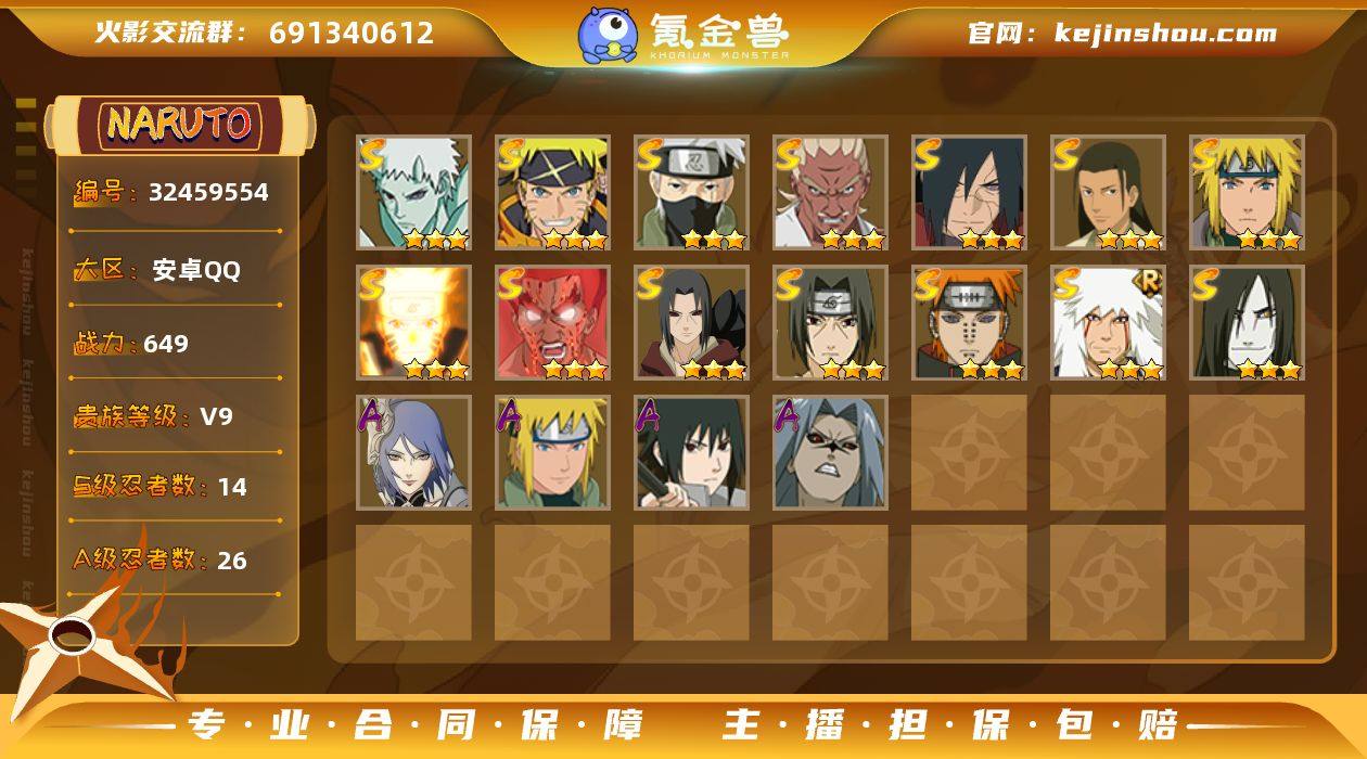 【火影忍者】战斗力:649W+;段位:见习1阶;VIP:V9级;S忍:14个;A忍:26个;通灵兽:15个,S忍:十尾人柱力宇智波带土|秽土转生解宇智波斑|须佐能乎旗木卡卡西|天道佩恩|漩涡鸣人宇智波佐助|秽土转生宇智波鼬|木叶创立千手柱间|忍界大战艾|舞之豪杰自来也|大蛇丸(普通)|波风水门|须佐能乎宇智波鼬|死门迈特凯|九喇嘛连结漩涡鸣人__A忍:青春爆炸迈特凯|仙人模式巳月|忍界大战李洛克|忍界大战日向宁次|青年长门|青年波风水门|青年艾|近松十人卫千代|须佐能乎宇智波佐助|忍界大战秋道丁次|疾风传咒印宇智波佐助|奇拉比(普通)|万花筒写轮眼宇智波佐助|死司凭血飞段|疾风传我爱罗 * 3星|飞段(普通) * 3星|漂泊浪客小南|神驹佑将小南|迈特凯(普通) * 3星|干柿鬼鲛(普通) * 3星|蝎(普通)|猿飞阿斯玛(普通) * 3星|桃式显现漩涡博人|最终章日向雏田|宇智波泉奈|忍界大战土台__通灵兽:忍犬(普通)|蓝蛇|蛤蟆吉|忍龟|镰鼬|猿魔|山椒鱼|蜃|蛤蟆仙人|鲛鲨|砂之守鹤|蛤蟆健|乌鸦(普通)|蛤蟆龙|蛤蟆广