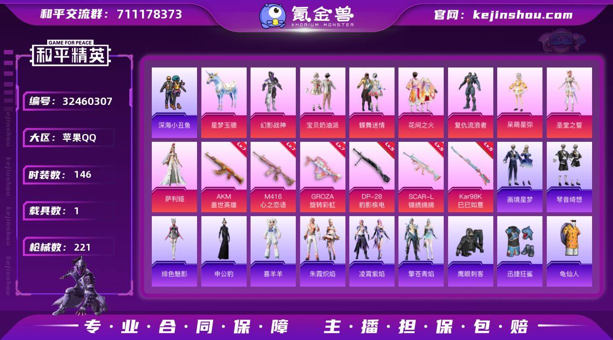 苹果 【 素材号 粉装-宝贝奶油派/幻影战神/复仇流浪者/暗影哥特/深海小丑鱼/AKM-盖世英雄(七级)/M416-心之恋语(七级)/星梦玉骢】手Q-8粉装-8特效枪-1载具-4粉色飞行器-66250热力值-14王牌印记-146套装-221枪皮 【热门品类】:套装-深海小丑鱼,套装-龟仙人,套装-暗影哥特 【粉色套装】:粉装-幻影战神,粉装-宝贝奶油派,粉装-蝶舞迷情,粉装-花间之火,角色-复仇流浪者,角色-呆萌星弥,角色-圣堂之誓,角色-萨利娅 【粉色枪皮等级】:AKM-盖世英雄(七级),SCAR-L-锦绣绵绵(五级),M416-心之恋语(七级),GROZA-旋转彩虹(七级),AKS-74U-森灵之息(五级),Kar98K-巳巳如意(五级),Mk14-福马献瑞(四级),DP-28-豹影疾电(五级) 【粉色载具】:星梦玉骢 【粉色枪皮】:AKM-盖世英雄,SCAR-L-锦绣绵绵,M416-心之恋语,GROZA-旋转彩虹,AKS-74U-森灵之息,Kar98K-巳巳如意,Mk14-福马献瑞,DP-28-豹影疾电 【粉色飞行器】:炫彩糖果飞行器,春暖花开飞行器,星之彼岸飞行器,极意拳锋飞行器 【粉色降落伞】:幻影战神降落伞,春暖花开降落伞,星之彼岸降落伞,洛神天依降落伞,庄周梦蝶降落伞,橘柚倾心降落伞,旋转彩虹降落伞,精灵梦叶罗丽降落伞,初号机 觉醒Ver.降落伞,精灵...