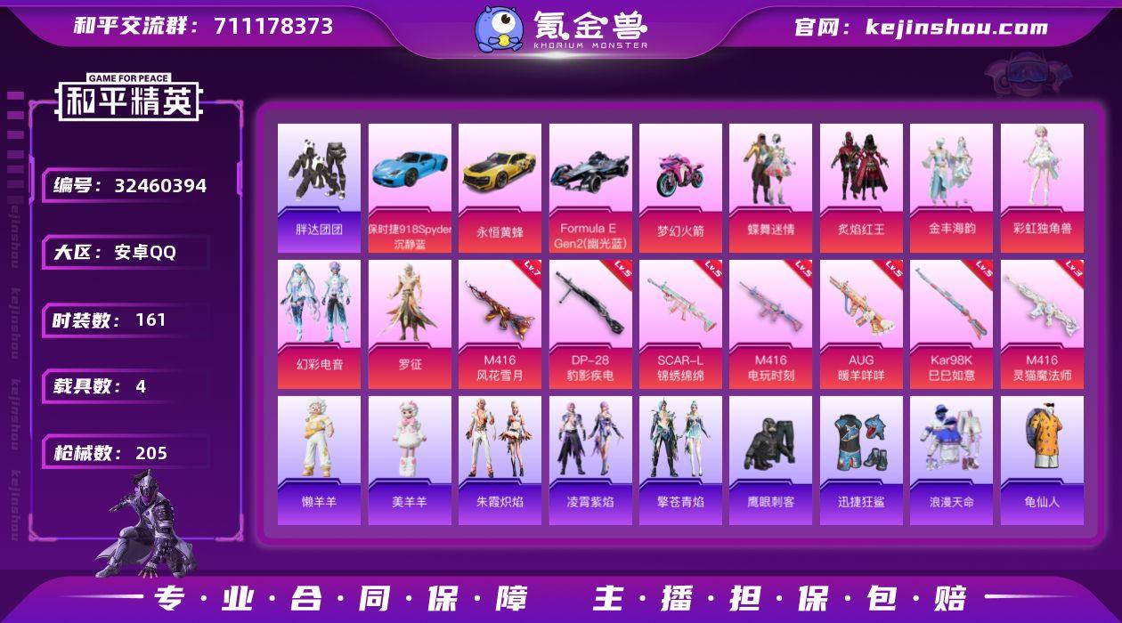 安卓 手Q-6粉装-10特效枪-4载具-8粉色飞行器-70974热力值-13王牌印记-161套装-205枪皮 【热门品类】:套装-浪漫天命,套装-胖达团团,套装-龟仙人,套装-暗影哥特 【粉色套装】:粉装-蝶舞迷情,粉装-炙焰红王,粉装-金丰海韵,角色-彩虹独角兽,粉装-幻彩电音,角色-罗征 【粉色枪皮等级】:SCAR-L-锦绣绵绵(五级),M416-风花雪月(七级),M416-电玩时刻(五级),M416-灵猫魔法师(三级),AUG-暖羊咩咩(五级),AUG-罪夜之冕(五级),UMP45-萌骑冒险(五级),Kar98K-巳巳如意(五级),Mk14-福马献瑞(二级),DP-28-豹影疾电(五级) 【粉色载具】:保时捷918 Spyder(沉静蓝),永恒黄蜂,Formula E Gen2(幽光蓝),双人摩托-梦幻火箭 【粉色枪皮】:SCAR-L-锦绣绵绵,M416-风花雪月,M416-电玩时刻,M416-灵猫魔法师,AUG-暖羊咩咩,AUG-罪夜之冕,UMP45-萌骑冒险,Kar98K-巳巳如意,Mk14-福马献瑞,DP-28-豹影疾电 【粉色飞行器】:炫彩糖果飞行器,梦幻火箭飞行器,沙丘之主天马,英伦信使飞行器,幻星舰长飞行器,终晖之翼飞行器,灵猫魔法师飞行器,飞天猪飞行器 【粉色降落伞】:绝对恒星降落伞,百万伏特降落伞,环太平洋降落伞,千面幻镜降落伞,第五大道降落伞,龙珠超降落伞...
