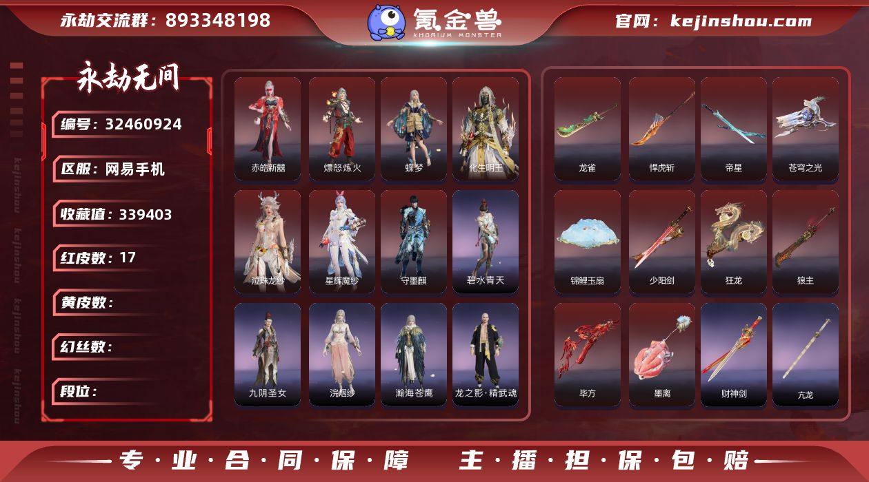 WJ5430,网易邮箱,4月5日可换绑,20红499金,等级457,收藏值353692,三人段位白银1,幻丝105821,金砖20,通行证Lv.8,声望1,变身器,揽九天,2674,初代机,炎烈珠,荆魂,西行劫,神君印,红色神品,香雪水兰,绝代风华,沙漠香风,星辉魔纱,执明神君,戎金狼,赤皓新囍,初代玄女,熛怒炼火,蝶梦,青龙将星,凌霄之羽,天罚,龙雀,狼主,灵犀,西行劫,如意金箍棒,狂龙,灵狐幻刃,帝星,角色金色皮肤,紫微星命,金襦玉衫,夏日派对,仲夏霜华,寒英素雪,姑射真人,麟鹿大铠,花之倾奇,苍雷丸,倒反阴阳,凛冬,观山海,青鸟,神鹰之女,惊云羽,浣烟纱,龙之道,求真,花无痕,金羽圣鹰,月轮魅影,葫芦兄弟,蛤蟆头领,观山海,秋神蓐收,西行劫,悟空,行空裘,百战,断链,观山海,冬神玄冥,春不敛,赤阳天狐,黄昏巫主,玄绶罗衣,绮云衫,西行劫,紫衣仙子,2674,千机喵,絮云衣,夜绸袍,夏日派对,半夏晚风,金财聚辉,开辟鸿蒙,日月明,暖冬茶馨,武道无穷,少林,若水尊者,龙之影,生死局,觉之一念,枫行者,净金宝相,八宝龙王,智绘,萍之缘,新倩女幽魂,流纨裙,怪诞狂想,红蓝狂想,斗罗大陆,唐三,银狼裘,噬月天狼,龙之影,龙虎斗,沙狼...