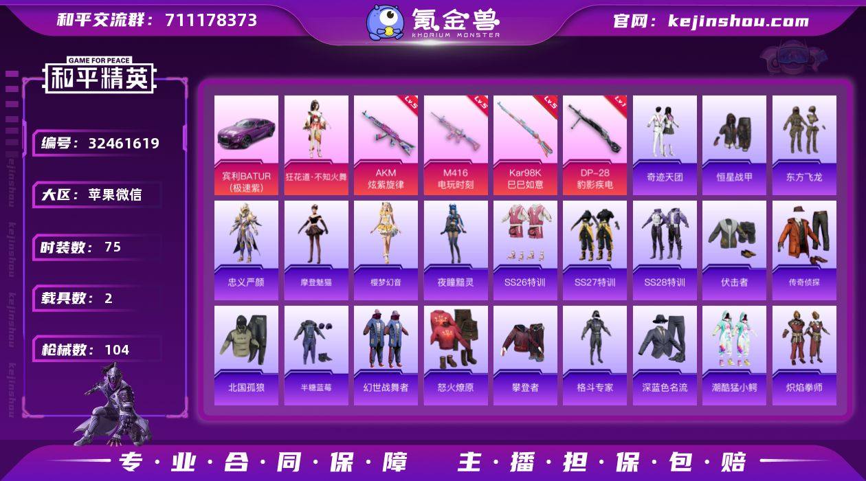 kk2474502-KK2177 苹果微信-14王牌印记-13粉装-6特效枪-1载具-87179热力值-207套装-271枪皮-2卓越印记-2传奇印记-都市猎人,奇异狩猎者,深海小丑鱼,TJB战队服-地铁满天赋42点 【13粉装】角色-异瞳寒姬,套装-梦幻火箭,套装-幻影战神,角色-宁雨蝶,套装-筑梦精灵,套装-炙焰红王,套装-紫电风暴,套装-薄荷物语,套装-宝贝奶油派,套装-天使彩虹糖,套装-仲夏莫吉托,套装-赤焰黑爵,套装-未来战士 【6特效枪】SCAR-L-青春物语/7级,SPAS-12-音爆索尼克/7级,M416-暖熊萌萌/7级,Kar98K-巳巳如意/5级,蜜獾-异瞳寒姬/6级,DP-28-豹影疾电/5级 【7稀有紫装】都市猎人,奇异狩猎者,深海小丑鱼,浪漫天命,迅捷狂鲨,小丑鱼,龟仙人 【1稀有载具】路特斯ELETRE(花绽灰) 【207稀有时装】梦幻火箭,宝贝奶油派,天使彩虹糖,幻影战神,宁雨蝶,异瞳寒姬,SS35特训,午间小调,SS31特训,SS33特训,SS32特训,SS36特训,蓝冰羽,琴音绮想,雪绒豹,恋语绒绒,星渊小夜曲,画境星梦,SS34特训,朱霞炽焰,紫幽梦,狂鲨锋刃,阳光菠萝,都市猎人,浪漫天命,奇异狩猎者,龟仙人,游乐,懒羊羊,深海小丑鱼,小丑鱼,迅捷狂鲨,凌霄紫焰,炫彩糖果,萌鸡速递,元气之梦,风迹短诗,薄荷星砂,秘语星愿,云朵鹅,雪国风尚,筑梦精灵,薄荷物语,赤焰黑爵,紫电风暴,炙焰红王,仲夏莫吉托,未来战士,狂花道·雅典娜,异域银装,白糯汤圆,鱼渊荷华,燕燕于飞,战术大师,雏菊兔兔,蝶变,巳巳如意,SS29特训,萝兰蝴蝶,明鸳圣池,贝斯之夜,沙丘之歌,焰鹰斗篷,英勇保护者,冰川谧蓝,湖雨初晴,福星高照,雪兔飞飞,虎虎生威吉莉,夏日音浪,龙的传人,花园小羊咩,军刀雅典娜,浓情摩卡,SS8特训,甜梦熊熊,青玉碎影,萌黄之夏,青翼流星,SS37特训,特训学院,猎鹰,青年教官,橘黑制服,红色运动,黄色运动,浓情蜜辣,蓝色运动,极速竞梦,黄色伏地魔,飞驰魅影,白色伏地魔,音速流光,活力之心,紫翼圣骑,湖蓝色名流,黄色名流,