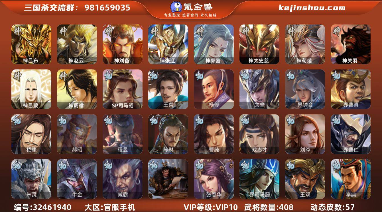 VIP等级: VIP10 官阶: 大将军 武将数量: 408 动态皮肤数量: 57 神将: 神郭嘉,神刘备,神吕布,神太史慈,神荀彧,神张辽,神赵云,神关羽,神吕蒙,神周瑜 魏国武将: 刘晔,戏志才,曹纯,陈琳,程昱,郝昭,嵇康,界曹真,界钟会,文鸯,杨修,王粲,张辽,SP蔡文姬,SP曹仁,SP关羽,SP贾诩,SP姜维,SP庞德,卞夫人,蔡贞姬,曹昂,曹操,曹冲,曹洪,曹丕,曹仁,曹叡,王异,张恭,鲁芝,界满宠,曹休,界曹植,满宠,荀攸,王基,钟繇,蒯越蒯良,郭嘉,荀彧,阮慧,杜畿,界郭嘉,崔琰,界曹丕,界荀彧,朱灵,界甄姬,吕虔,界王异,界许褚,界郭淮,华歆,陈群,界邓艾,界典韦,李通,乐进,辛宪英,郭淮,毛玠,界曹彰,郭皇后,毌丘俭,夏侯惇,曹植,司马朗,谋于禁,界曹操,许褚,界张辽,谋徐晃,张郃,钟会,文聘,曹彰,界夏侯惇,诸葛诞,司马懿,甄姬,界徐晃,徐晃,界曹仁,孙资刘放,韩浩史涣,胡班,曹真,典韦,界夏侯渊,夏侯渊,李典,于禁,王双,邓艾,界司马懿,张春华,孟达-魏,臧霸,牛金,朱灵(国战),SP司马昭 蜀国武将: 董允,花鬘,界黄忠,谯周,沙摩柯,王平,张星彩,赵襄,周群,诸葛瞻,谋马超,谋赵云,马云騄,徐庶,界魏延,杨仪,吕凯,界关羽,界诸葛亮,邓芝,界伊籍,胡金定,费祎,严颜,界黄月英,赵云,张松,彭羕,李丰,界刘备,界刘禅,刘封,糜竺,蒋琬,谋庞统,黄月英,...