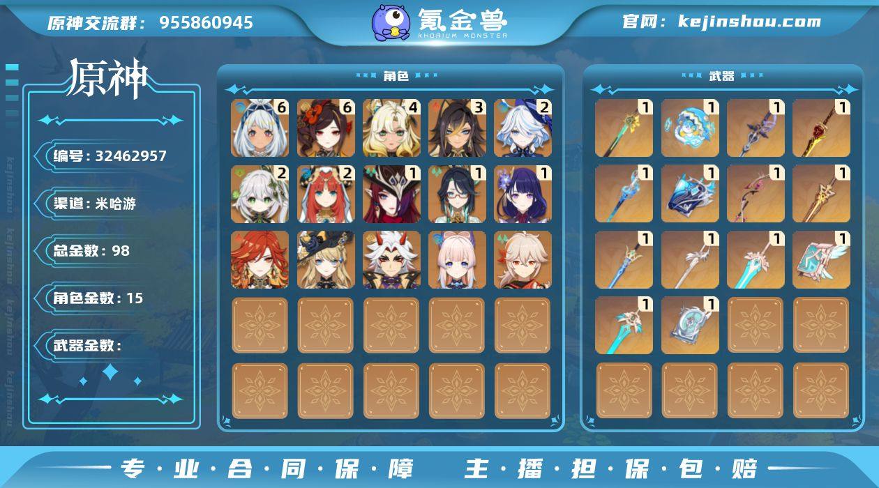 冒险等级:60 总黄数:115 5星角色数:35 5星武器数:29 原石数量:3 相遇之缘数量:0 纠缠之源数量:30 6命玛薇卡,6命芙宁娜,6命提纳里,6命迪卢克,5命琴,4命莫娜,3命雷电将军,3命七七,2命纳西妲,2命神里绫华,1命阿蕾奇诺,1命那维莱特,1命白术,1命夜兰,1命胡桃,1命刻晴,0命丝柯克,0命瓦雷莎,0命茜特菈莉,0命恰斯卡,0命希诺宁,0命闲云,0命莱欧斯利,0命流浪者,0命妮露,0命八重神子,0命申鹤,0命珊瑚宫心海,0命宵宫,0命枫原万叶,0命甘雨,0命钟离,0命可莉,0命温迪,0命迪希雅 6命班尼特,6命嘉明,6命久岐忍,6命卡齐娜,6命绮良良,6命香菱,6命行秋,6命夏洛蒂,6命伊安珊,6命芭芭拉,6命北斗,6命重云,6命迪奥娜,6命多莉,6命珐露珊,6命菲谢尔,6命九条裟罗,6命坎蒂丝,6命柯莱,6命雷泽,6命罗莎莉亚,6命莱依拉,6命鹿野院平藏,6命诺艾尔,6命凝光,6命砂糖,6命托马,6命五郎,6命辛焱,6命烟绯,6命瑶瑶,6命云堇,6命早柚,5命菲米尼,5命琳妮特,5命米卡,4命夏沃蕾,4命卡维,3命欧洛伦,3命赛索斯,3命凯亚,2命蓝砚,2命丽莎,1命塔利雅,0命爱诺,0命安柏 精2阿莫斯之弓,精2无工之剑,精1祭星者之望,精1焚曜千阳,精1赤月之形,精1静水流涌之辉,精1金流监督,精1万世流涌大典,精1最初的大魔术,精1碧落之珑,精1裁叶萃光,精1千夜浮梦,精1圣显之钥,精1若水,精1息灾,精1薙草之稻光,精1飞雷之弦振,精1雾切之回光,精1护摩之杖,精1和璞鸢,精1风鹰剑,精1天空之傲,精1天空之卷,精1天空之脊,精1天空之刃,精1四风原典 100%侦察骑士,古恩希尔德的传承,帆影游风,极夜真梦,倩影游侠,岁夜欢哗,星与月之约,雨化竹身,叶隐芳名,致教会自由人 卖家说:出邮箱不要了,很安全