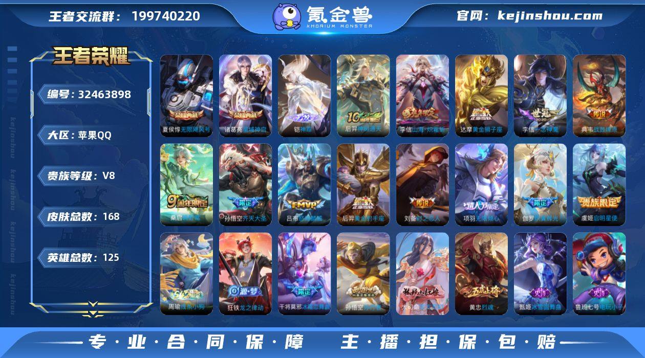 苹果Q-V8-至尊星耀IV段位-125英雄-168皮肤-2典藏皮肤-1无双-13传说-49史诗Lk26293 【荣耀典藏】:夏侯惇无限飓风号,诸葛亮星域神启 【无双皮肤】:铠神罪 【传说皮肤】:后羿神树通天,桑启鸣野蒿,典韦战鼓燎原,项羽无限倾心,伽罗炽翼辉光,孙悟空齐天大圣,李信山海炽霜斩,吕布怒海麟威,虞姬启明星使,李信一念神魔,刘备时之恋人,达摩黄金狮子座,后羿黄金射手座 【限定皮肤】:蔡文姬夏日便利店,虞姬夏日便利店,姜子牙天穹之誓,狄仁杰阴阳师,赵云皇家上将,高渐离玩趣恶龙,钟无艳超时空战士,白起夜都怪侠,元歌无心,甄姬落雪兰心,狄仁杰魔术师,达摩沙漠行僧,项羽海滩派对,项羽无限倾心,兰陵王金庭之子,孙悟空孙行者,孙悟空齐天大圣,李元芳云中旅人,虞姬启明星使,干将莫邪冰霜恋舞曲,鬼谷子五谷丰年,黄忠烈魂,苏烈千军破阵,沈梦溪大漠名商,明世隐吟游魔法,裴擒虎擒涛扼浪,李信山海炽霜斩,伽罗炽翼辉光,盾山梦圆繁星,鲁班大师探海日志,桑启海盐诗旅,张良古海寻踪,鬼谷子天穹祈灯,沈梦溪龙舞盛年,刘邦剑破天穹,周瑜熔金海岸 【年限皮肤】:李信山海炽霜斩 【赛季限定】:苏烈千军破阵,达摩沙漠行僧,兰陵王金庭之子,沈梦溪大漠名商...