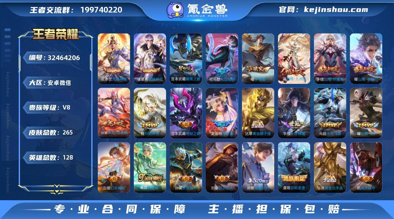 安卓WX-V8-257皮肤-2典藏皮肤-21传说-87史诗 【英雄全皮】:孙权全皮,夏洛特全皮,影全皮 【荣耀典藏】:诸葛亮星域神启,花木兰九霄神辉 【传说皮肤】:司马懿九山相柳,澜愿照九州拓,云缨幻光神枪,桑启鸣野蒿,孙策乘龙淬吴钩,夏洛特浮生妄,曜山海苍雷引,李信山海炽霜斩,马超无双飞将,孙策挚爱之约,孙策末日机甲,曜李逍遥 ,铠绛天战甲,镜炽阳神光,虞姬启明星使,曜云鹰飞将,李信一念神魔,刘备时之恋人,张良黄金白羊座,达摩黄金狮子座,宫本武藏地狱之眼 【限定皮肤】:蔡文姬夏日便利店,虞姬夏日便利店,姜子牙天穹之誓,狄仁杰阴阳师,赵云皇家上将,高渐离玩趣恶龙,白起夜都怪侠,芈月幻夜卜梦,元歌无心,马可波罗暗影游猎,狄仁杰魔术师,达摩沙漠行僧,项羽海滩派对,韩信飞衡,兰陵王金庭之子,后羿圣弓游侠,刘备百相守梦,李元芳云中旅人,虞姬启明星使,钟馗驱傩正仪,杨玉环遇见飞天,干将莫邪真爱魔法,雅典娜黎明之约,鬼谷子五谷丰年,黄忠火炮绅士,苏烈千军破阵,百里玄策原初追逐者,梦奇顽趣,沈梦溪大漠名商,明世隐吟游魔法,裴擒虎擒涛扼浪,云中君纤云弄巧,李信山海炽霜斩,孙策挚爱之约,上官婉儿梁祝,嫦娥拒霜思,嫦娥暖冬兔眠...