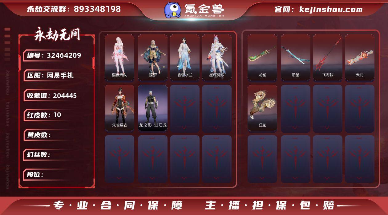 YJJ1948/4.17换绑/等级291/s19三人黄金3/10红334金收藏值204445/星辉魔纱/朱雀星衣/樱云天女/蝶梦/香雪水兰/天罚/帝星/龙雀/飞将戟/狂龙/2674·初代机/剪纸·彩刀/龙之影·过江龙/幻丝116528/已绑定手游