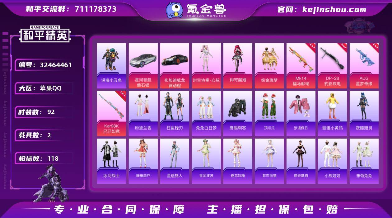 M1047011【AUG-星梦奇缘[6级]2载具-3粉装-4特效枪 深海小丑鱼,暗影哥特,浪漫天命 绯穹魔姬】苹果手Q-2载具-3粉装-4特效枪-92套装-118枪皮-3王牌印记-荣耀皇冠Ⅴ-37972热力值【2载具】星河领航(磐石银),布加迪威龙(律动橙)【3粉装】绚金瑰梦,时空协奏·心弦,角色-绯穹魔姬【4特效枪】Kar98K-巳巳如意[4级],AUG-星梦奇缘[6级],DP-28-豹影疾电[5级],Mk14-福马献瑞[5级]【3稀有】深海小丑鱼,暗影哥特,浪漫天命【9飞行器】顶峰精英尾迹,登顶巅峰飞行器,异域银装飞行器,狂鲨锋刃飞行器,香车宝马飞行器,极意拳锋飞行器,镜光幻境飞行翼,鸡智如我飞行器,炫彩糖果飞行器【200其它衣服和枪皮】人气偶像,无暇誓言,异域银装,白糯汤圆,角色-粉雾星云,SS33特训,街头潮人,糖糖葫芦,锦衣飞扬,巳巳如意,雪国风尚,SS32特训,雨过天青,月蓝流光,马上有钱,幻影武者,冰河战士,竞技达人朋克,快闪甜心,黄色名流,深海梦境,青翼流星,青涩时光,霓虹街区,角色-夜瞳黯灵,SS31特训,狂鲨锋刃,旭日情侣,元素星魂,角色-极地流光,顶瓜瓜,薄荷星砂,竞技名士,尼罗河传说,青团波波,天籁歌者,玉兔迎春,福马献瑞,蓝色运动,鹰眼刺客,都市魅力,角色-摩登魅猫,SS37特训,大橘大利,灼焰舞者,长空猛禽,小熊娃娃,缤纷果语,SS30特...