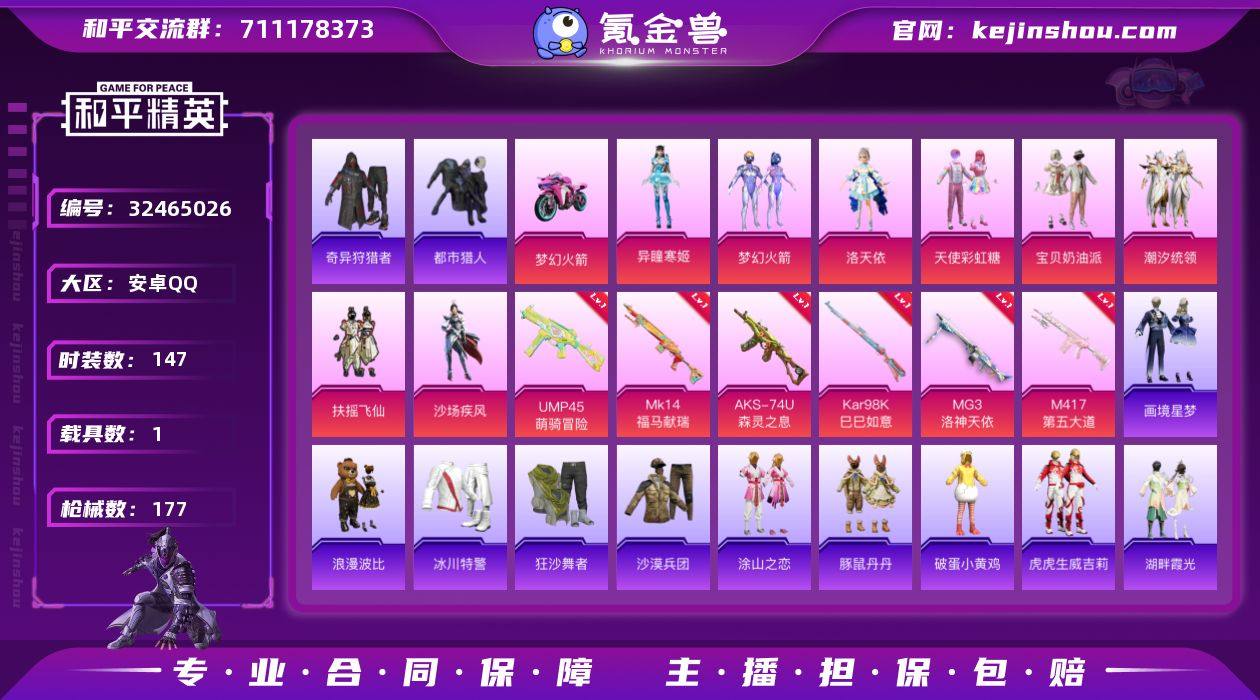 M1047027【身法号1载具-8粉装-6特效枪 梦幻火箭 洛天依 宝贝奶油派 天使彩虹糖 小丑鱼全套 都市猎人,暗影哥特,狂沙舞者,浪漫天命,童话森林】安卓手Q-1载具-8粉装-6特效枪-147套装-177枪皮-3王牌印记-卓越王牌6星-64883热力值【1载具】双人摩托-梦幻火箭【8粉装】扶摇飞仙,天使彩虹糖,角色-异瞳寒姬,沙场疾风,宝贝奶油派,潮汐统领,梦幻火箭,角色-洛天依【6特效枪】Kar98K-巳巳如意[2级],Mk14-福马献瑞[5级],MG3-洛神天依[7级],M417-第五大道[7级],AKS-74U-森灵之息[4级],UMP45-萌骑冒险[3级]【15稀有】奇异狩猎者,小丑鱼,都市猎人,暗影哥特,狂沙舞者,浪漫天命,童话森林,S686-奇异狩猎者,M762-奇异狩猎者,M24-奇异狩猎者,汤姆逊-奇异狩猎者,AKM-奇异狩猎者,Kar98K-童话森林,SCAR-L-浪客战士,SKS-浪客战士【6飞行器】甜蜜誓约飞行器,齐天大圣飞行器,四圣焕新飞行器,马上有福飞行器,炫彩糖果飞行器,马卡龙飞行器【4头盔】心之恋语头盔,幻影战神头盔,甜心宝贝头盔,马卡龙头盔【5背包】心之恋语背包,梦幻火箭背包,甜蜜誓约背包,马卡龙背包,甜心宝贝背包【295其它衣服和枪皮】旭日情侣,SS19特训,特训学院,SS15特训,人气偶像,SS17特训,黑色伏地魔,神秘领域,SS14特训,SS35特训,粉甜马卡...