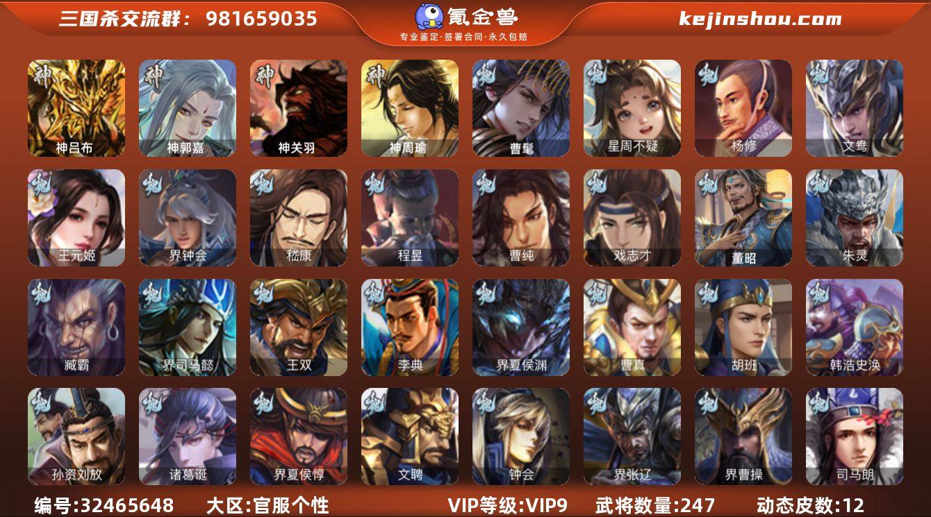 VIP等级: VIP9 官阶: 骠骑将军 武将数量: 247 动态皮肤数量: 12 神将: 神郭嘉,神吕布,神关羽,神周瑜 魏国武将: 戏志才,曹纯,程昱,嵇康,界钟会,王元姬,文鸯,杨修,张辽,SP关羽,SP姜维,蔡贞姬,曹昂,曹操,曹冲,曹丕,曹仁,曹叡,王异,鲁芝,曹休,界曹植,满宠,荀攸,王基,钟繇,郭嘉,牵招,荀彧,阮慧,界郭嘉,崔琰,朱灵,吕虔,界王异,陈群,李通,乐进,辛宪英,郭淮,郭皇后,夏侯惇,司马朗,谋于禁,界曹操,星周不疑,许褚,界张辽,谋徐晃,张郃,钟会,文聘,曹彰,界夏侯惇,诸葛诞,司马懿,甄姬,徐晃,孙资刘放,韩浩史涣,胡班,曹真,典韦,界夏侯渊,夏侯渊,李典,于禁,王双,邓艾,界司马懿,臧霸,朱灵(国战),曹髦,董昭 蜀国武将: 花鬘,沙摩柯,徐庶,界魏延,杨仪,界伊籍,费祎,界张嶷,赵云,张松,彭羕,界刘备,刘封,糜竺,谋庞统,黄月英,刘巴,关羽,吴懿,祝融,张飞,魏延,马忠,界法正,糜夫人,刘禅,界赵云,SP孙尚香,SP徐庶,卧龙诸葛,周仓,简雍,界关兴张苞,诸葛亮,界张飞,法正,界简雍,赵统赵广,界马岱,关平,马岱,界庞统,庞统,诸葛果,马谡,马超,廖化,关兴张苞,孟获,黄忠,刘备,界马超,李严,马良,刘谌,彭羕(国战),甘夫人 吴国武将: 界徐盛,文鸯,周泰,吕蒙,诸葛恪,界孙尚香,界顾雍,桥公,谋周瑜,丁奉,界全琮,孙茹,顾雍,阚泽,...