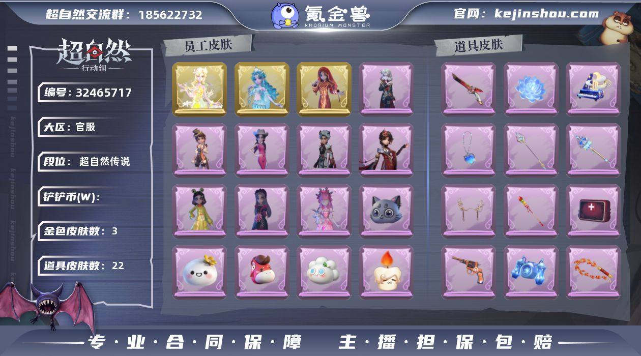 皮肤:海月息潮,镜花辞,春之声,呱呱雨衣,耀眼的你,丝缕哀歌,庆宴绮愿,仙锋小姐,倩公主,黎明猎手,梵卓之礼 道具:露露扇(扇子),红运福虎(腰包),飞花令(背包),波塞冬糖葫芦霸王枪(长枪),缚誓之锁新春炸响(长鞭),海洋之心花落精绝(摸金符),安魂曲赞萌露比水枪(猎枪),敛花容金丝眼镜(夜视仪),月光奏鸣曲鸣沙鼓happy猫(音响),乘风溯雪花(喷气背包),新星时代(手枪),权杖的许诺(电击枪),冰晶般的代价(除颤仪),蔷薇物语(急救包),金戈玄铜(闪光弹) 美妆:听潮祝福 现在资产1755万,梦居有6套陶俑,有两套差5个集齐,圣杯5个,白玉杯16个,大剑一柜子多一点,年卡两套。 怪物:两秦帝两少帝,咚咚怪6只多,真天王1只,厄狼6包多,天王四包,女王3只左右,神圣有两只。其他怪都有