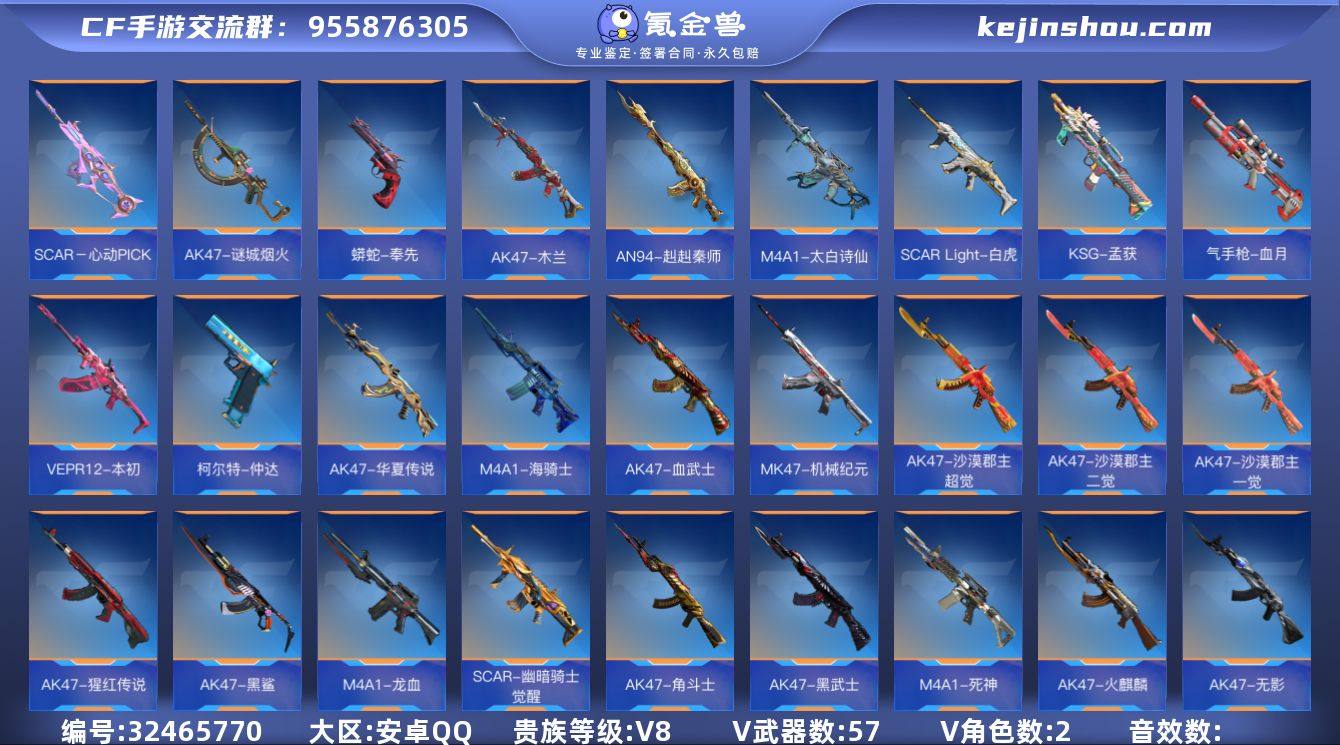 x2198 VIP8级,魄至尊,心至尊,怒至尊,女团王魂,白金王魂,女团王魄,王烈,P90雷暴王者,冰皮王腾,王怒,王狱,王影,王心,王锋,冰皮王圣,AK奉先,M4星象,VEPR12-本初,KSG孟获,M4仲达,王心雷,王竞雷,王者之圣烟雾弹,王者之圣闪光弹,葵,瞳,狙击枪线1消灭音效3;【王者武器】:王者之魂,王者之魄,王者之烈,P90-雷暴王者,王者之心手雷,王者之腾,王者之怒,王者之狱,王者之影,王者之心,王者之锋,王者之竞手雷,王者之圣闪光弹,王者之心闪光弹,王者之圣,王者之心烟雾弹,王者之圣烟雾弹,王者之竞烟雾弹,王者之竞闪光弹;【三国武器】:AK47-奉先,思召剑,方天画戟,穷奇铁扇,CZ75-策,柯尔特-仲达,蟒蛇-奉先,双持GLOCK18-本初,M4A1-星象,VEPR12-本初,KSG-孟获,M4A1-仲达;【热门武器】:沙鹰-修罗,USP-仲康,USP-神罚,沙鹰-飞电,USP-太白诗仙,USP-机械迷城,烈焰弓,气手枪-血月,KSG-钟馗觉醒,左轮-黑武士,AK47-破空冰刃,AK47-木兰,AK47-血武士,AK47-谜城烟火,AK47-黑鲨,AK47-华夏传说,M4A1-黑骑士,M4A1-雷神,M4A1-死神,AK47-沙漠郡主-超觉,斩神刀,末日裁决觉醒,斩神刀-雷暴,丛林匕首-庆龙觉醒,马来剑-耀金伯爵,...