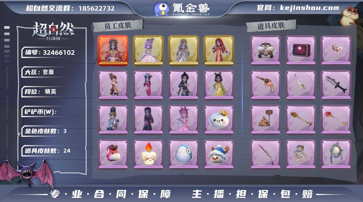 红皮1;金皮3;紫皮7;道具皮23;皮肤:巫铃儿-镜生遗梦,薇薇安-圣光之谕,巫铃儿-镜花辞,小黄-遗失的童话,爱丽丝-丝缕哀歌,阿念-王子与骑士,逍遥-绣春逍影,莉莉-情公主,爱丽丝-耀眼的你,阿念-庆宴绮愿,小黄-呱呱雨衣;道具:音响-鸣沙鼓,专业手电-云端梦想计划,桃木剑-凤鸣九天,葫芦-伏妖塔,铲子-卡皮巴拉小黄豚铲,急救包-蔷薇物语,腰包-宝剑八,刺刀-碧络琅环,铲子-圣心之泪,音响-happy猫,黄牛能量饮料-青玉抱丹,电击枪-甜蜜泡泡枪,摸金符-祝祷词,传送按钮-昆仑镜,转轮手枪-新星时代,急救包-土拨鼠捏捏,短管猎枪-星光的裁决,铲子-龙鳞,刺刀-小鲨匕首,额外的背包-飞花令,闪光弹-金戈玄铜,夜视仪-金丝眼镜,长鞭-小狗蛇点点鞭;饰品:头饰-大葱明头套,头饰-蒜了八,头饰-炙热烧烤,头饰-萨卡班甲鱼头套,头饰-芝麻糊汤圆,头饰-惊魂南瓜头套,头饰-卑微头套,头饰-嘻嘻头套,头饰-哈士奇头套,头饰-樱桃奶油布丁,头饰-精致露比头套,头饰-鱼头怪头套,头饰-烈焰红唇头套,头饰-太空鲨头套,头饰-火爆了头套,头饰-呆滞头套,头饰-雪墩墩头套,头饰-面具马头套,头饰-马上有钱