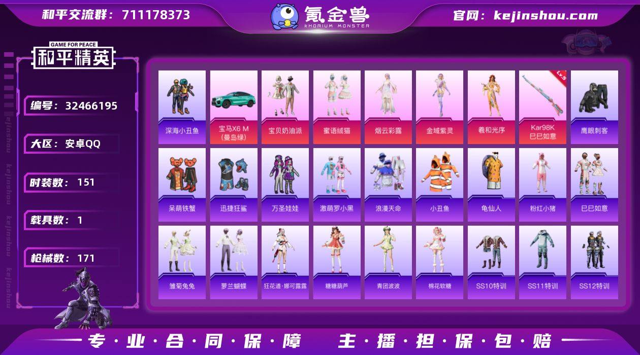 安卓 手Q-6粉装-1特效枪-1载具-1粉色飞行器-51702热力值-13王牌印记-151套装-171枪皮 【热门品类】:绝对防御上衣,套装-浪漫天命,套装-深海小丑鱼,套装-小丑鱼,套装-龟仙人,套装-粉红小猪 【粉色套装】:粉装-宝贝奶油派,粉装-蜜语绒猫,角色-烟云彩露,角色-金域紫灵,角色-羲和光序 【粉色枪皮等级】:Kar98K-巳巳如意(五级) 【粉色载具】:宝马X6 M(曼岛绿) 【粉色枪皮】:Kar98K-巳巳如意 【粉色飞行器】:英伦信使飞行器 【粉色降落伞】:夏日绵绵冰降落伞,烈焰拳霸降落伞,暗夜玫瑰降落伞,时空协奏降落伞 【稀有套装】:套装-龟仙人,套装-巳巳如意,套装-雏菊兔兔,套装-萝兰蝴蝶,角色-狂花道·娜可露露,套装-糖糖葫芦,套装-青团波波,套装-棉花软糖 【稀有枪皮】:AKM-冰凉西瓜,AKM-夜灯,AKM-奇异狩猎者,AKM-小鹦鹉BEBE,AKM-彩虹符号,AKM-破晓战魂,AKM-缤纷海域,AKM-萌趣颜团子,AKM-虎虎生威,AKM-霓虹街区,M16A4-夜灯,M16A4-幻世战舞者,M16A4-蓝色火焰,M16A4-千金淑猫,SCAR-L-炫彩节奏,SCAR-L-红色方程式,SCAR-L-黄金龙骨,M416-夜灯,M416-红色方程式,M416-绯红前夜,M416-蓝色火焰,GROZA-异彩先驱,GROZA-彩虹符号,GROZA-懵萌河马,...