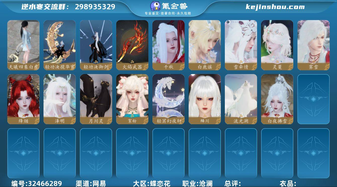 【区服】 踏月留香 【战力值】 164.64 【职业】 沧澜 【馆藏】 7级 【衣品值】 290930 【国色值】 65100 【已用天赏石】 29 【天霓染数量】 3 【充值称号】 把酒临风 【累计充值】 44507元 【天霓染】 似水幽华*1, 四海无拘*1, 古道西风*1 【灵韵内功】 汲川, 灵犀 【副本外观】 白夜拂雪*1, 霜途无间 【天赏外观】 千秋, 絮粉, 鳞川, 泽明, 霁雪, 绛烟, 灵蔓, 雪牵情, 白鹿谣, 火焰武器, 轻功诀御剑, 轻功诀揽华宵, 天曦四象·白虎 【天赏祥瑞】 轻冥幻夜轩, 月川灵, 流光溯 【祥瑞坐骑】 风行·江湖景, 骋风叱焰, 风行·世间情, 贺岁喜狮, 风行·万灯明, 呆宝, 布丁, 云螭·庆舞迎春, 龙衔瑞焰, 丹锦喜狮, 甜点鼠鼠, 金冠鼠鼠, 纵风甲车·赤, 粉黛娇, 幻琉晶, 狂霸天, 星河转·银昼, 星河转·金夕, 星河转·赤夜, 伯力, 咩郎, 瓜皮, 墨流云·玄色, 墨流云·朱红, 墨流云·靛青, 奔虹赤, 彩虹小马, 木小马, 独步悠然车, 玉霄飞练, 隐云涧, 花花团子, 鱼逢岁禧, 梅香团子, 鱼曳金霞, 绒绒夜, 银砂素波, 牛奶酥, 四方游士, 逍遥游, 空山闲 【商城外观】 摩登风尚, 海盐甜梦, 宝禄纳财, 月光奏鸣, 如约鹅至, 甜宙漫游, 雪庭问宋, 星棱舞曲, 苍蓝微风, 墨喧雪绒, 聆沙神祝, 雪团云绒, 羽信絮...