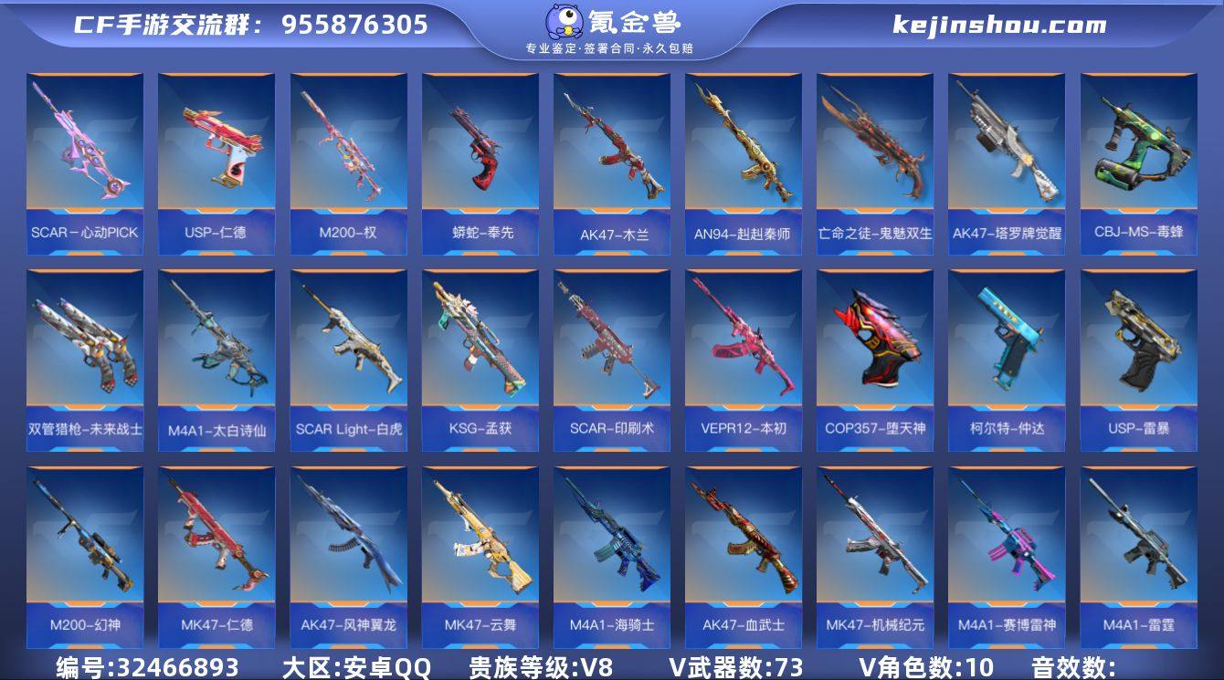 FC-QKQSVM 安卓QQ,成人号:是,角色等级:166,实名:有修改人脸机会/实名是本人,段位:枪圣,VIP等级:V9,V武器数量:247,V角色数量:11,V总数量:229,王者武器数:28,万化数量:474, 【人物角色】云悠悠,关小雨,幽灵刀锋-觉醒,堕天使,复仇者,葵,夏日灵狐,春节兰,审判者,曼陀罗,夜玫瑰,潘多拉,斯沃特,雅典娜,职场灵狐-赛事经理, 【王者武器】王者之兽,M12S-雷霆王者,王者之势闪光弹,王者之心手雷,王者之影手雷,王者之兽手雷,王者之心烟雾弹,王者之心闪光弹,王者之翼闪光弹,王者之影闪光弹,王者之影烟雾弹,王者之势烟雾弹,王者之翼烟雾弹,王者之心,王者之影,王者之魄,王者之势,王者之戮,王者之怒,王者之光,王者之魂,王者之灵,王者之锋,王者之啸,王者之击,王者之烈,王者之神,王者之狱, 【至尊套装】影至尊,戮至尊,怒至尊,心至尊,魄至尊, 【带V枪械】47-云舞-千变,AWM-天龙-魔神,王者之击-冰霜奇迹,AK47-无影-荣耀酷本,AK47-游骑兵-紫魇,AK47-黑武士觉醒-能量核心,M4A1-机械迷城,AK47-孟德-过载,AK47-幸运日觉醒-千变,M4A1-樱龙·超觉,M4A1-星象,M4A1-游骑兵,M4A1-黑龙,M4A1-黑骑士,M4A1-雷神,47-云舞,AK47-血武士,COP 357-雷神-能量核心,AK47-幸运日觉醒,AK47-孟德,AK47-奉先,AK47-竞技战魂,COP 357-堕天神,M4A1-雷神-枪神之魄,AK47-无影-葵,AK47-Rush-星速,M4A1-黑龙-能量核心,AK47-火麒麟-灵狐,M4A1-游骑兵-寒霜,AK47-冰魂觉醒,M4A1-黑骑士-电竞之皇,AK47-耀金伯爵,AK47-游骑兵,M4A1-雷神-荣耀蛮蛮,AK47-角斗士,AK47-沙漠领主,AK47-黑武士觉醒,AK47-火麒麟,AK47-无影,81式-光明之神,AN94-超新星,SKS-美杜莎,SCAR-文远,剑齿虎-炫彩,QBZ03-金色蔷薇,王者之心-冰霜奇迹,M200-幻神,巴雷特-毁灭