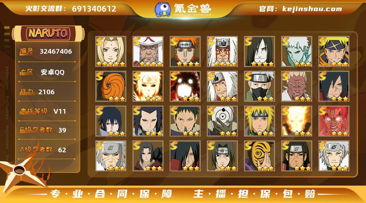 【性价比高战带黑绝】y6733 战力2101w 39s 62a 熊猫 夏日乌鸦 6800金币 忍法帖198已开107级 7个198点券A 传说时装差个凯 秽土斑个性名片 五星纲手 四星仙人自来也 大蛇丸 7佩恩 三代火影 39片柱间 60片神剧斑 54片烈斗 50片天道超