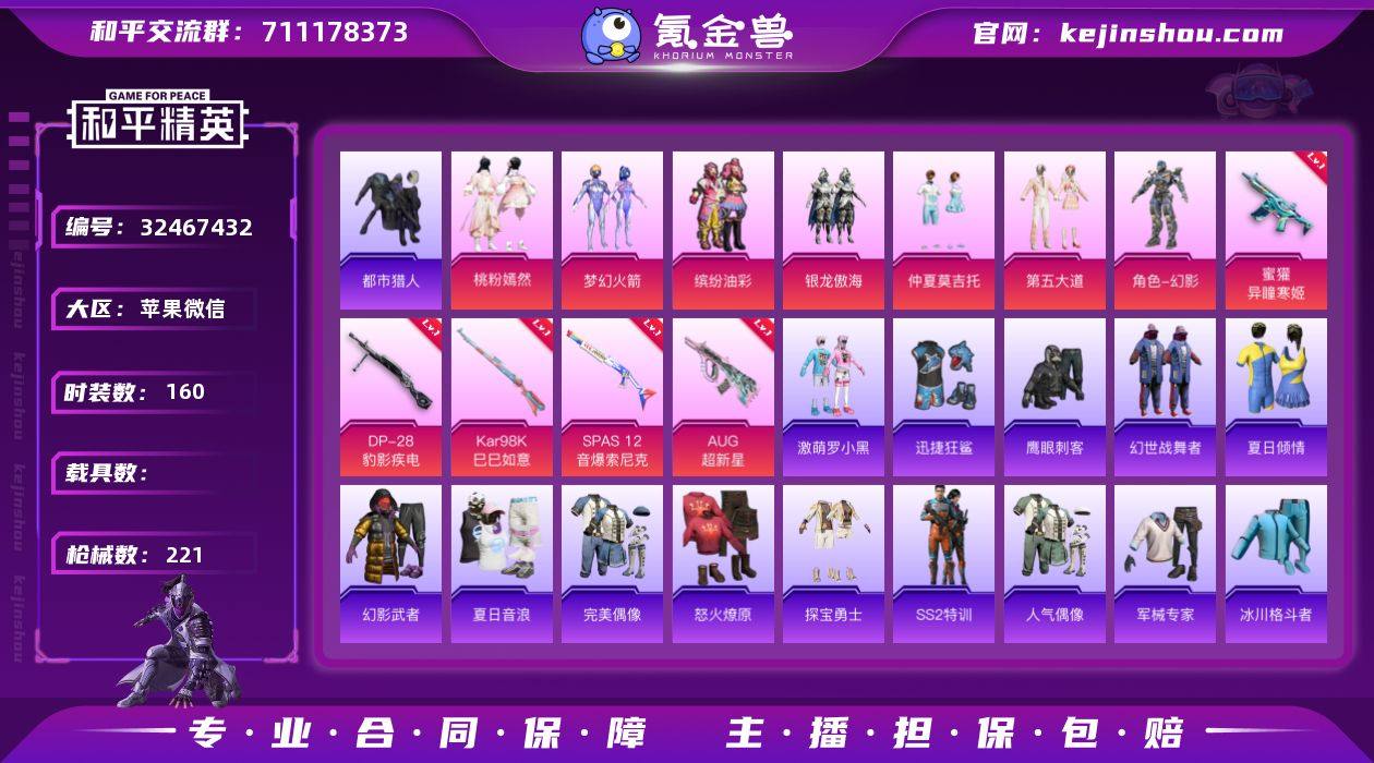 【都市梦幻猪脸6粉装5特效枪 苹果ID关闭不了无法改实名】 苹果V区-65253热力值-160套装-221枪皮 【1稀有】 都市猎人【6粉装】 缤纷油彩(猪脸妹) 梦幻火箭 第五大道 银龙傲海 仲夏莫吉托 桃粉嫣然【5特效枪】 AUG-超新星(4级) SPAS-12-音爆索尼克(7级) Kar98K-巳巳如意(5级) DP-28-豹影疾电(5级) 蜜獾-异瞳寒姬(6级)【51热门】 M416-神秘黑猫 M416-蓝色火焰 GROZA-异彩先驱 GROZA-蓝莓炮弹 粉甜马卡龙 GROZA-彩虹符号 长空猛禽 异彩先驱 甜蜜熊情侣 牛气冲天 霓虹街区 霓虹极客 妙红点点 都市猎人(蓝口罩) 黑色刀锋 鹰眼刺客 破蛋小黄鸡 激萌罗小黑 迅捷狂鲨 暗影哥特(红眼罩) 极速红龙 醒狮腾龙 团圆交子 瑞龙福将 狂沙舞者 冰川格斗者 白色伏地魔 SS24特训 SS23特训 SS22特训 Mk47-洛神天依 Mini14-梦幻火箭 AWM-不夜海上花 GROZA-乌木金纹 SCAR-L-玉兔迎春 GROZA-田园牧歌 M762-天降萌叽 Mk47-乌木金纹 Mini14-旋转彩虹 UZI-娇憨猪猪 UMP45-蓝色火焰 S12K-垂柳戏鸭 DBS-彩虹符号 MG3-幻世战舞者 AKM-虎虎生威 M416-暗夜行者【4飞行器】 光之冒险尾迹 粉色滑翔尾迹 红色滑翔尾迹 炫彩糖果飞行器 营地ID:703788905