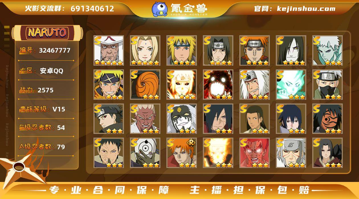 区服:1490 实名:可二次实名 贵族等级:V15 战力值:2222222222 S忍数:50 A忍数:99 五星漩涡鸣人·宇智波佐助,五星宇智波斑「五影会谈」,三星宇智波斑「神驹佑将」,三星宇智波带土「十尾人柱力」,三星波风水门「九喇嘛连结」,三星烈斗「初代目风影」,三星漩涡鸣人「暴怒·第六尾」,三星自来也「传说中的三忍」,三星大筒木舍人「最终章」,三星旗木卡卡西「须佐能乎」,三星宇智波止水「须佐能乎」,三星艾「忍界大战」,三星大筒木桃式,三星宇智波斑「秽土转生·解」,三星千手柱间·木叶创立,三星宇智波佐助「永恒万花筒」,三星三代目风影「秽土转生」,三星神秘面具男「红夜之刃」,三星宇智波带土「忍界大战」,三星宇智波斑「白面具」,三星波风水门,三星佩恩·天道「超」,三星漩涡鸣人「九喇嘛连结」,三星迈特凯「死门」,三星千手扉间「秽土转生」,三星宇智波鼬「秽土转生」,三星宇智波斑「秽土转生」,三星宇智波鼬「须佐能乎」,三星神秘面具男,三星千手柱间「秽土转生」,三星猿飞日斩,三星千手扉间,三星波风水门「秽土转生」,三星千手柱间,三星宇智波斑,三星猿飞日斩「秽土转生」,三星纲手「百豪」,三星药师兜「仙人模式」,三星罗砂「四代目风影」,三星金角/银角「秽土转生」,三星宇智波斑「木叶创立」,三星半藏「秽土转生」,三星无「二代目土影」,三星长门「秽土转生」,三星佩恩「天道」,三星自来也,三星自来也「仙人模式」,三星鬼灯幻月「二代目水影」,三星大野木「忍界大战」,三星大野木「三代目土影」,三星艾「四代目雷影」,三星艾「三代目雷影」,三星纲手,三星春野樱「忍界大战」,三星大筒木金式「博人传」,三星自来也「舞之豪杰」,三星大蛇丸 三星猿飞阿斯玛「神驹佑将」 卖家说:氪条十五万元,v15,几乎全角色,差的s也都不到20片