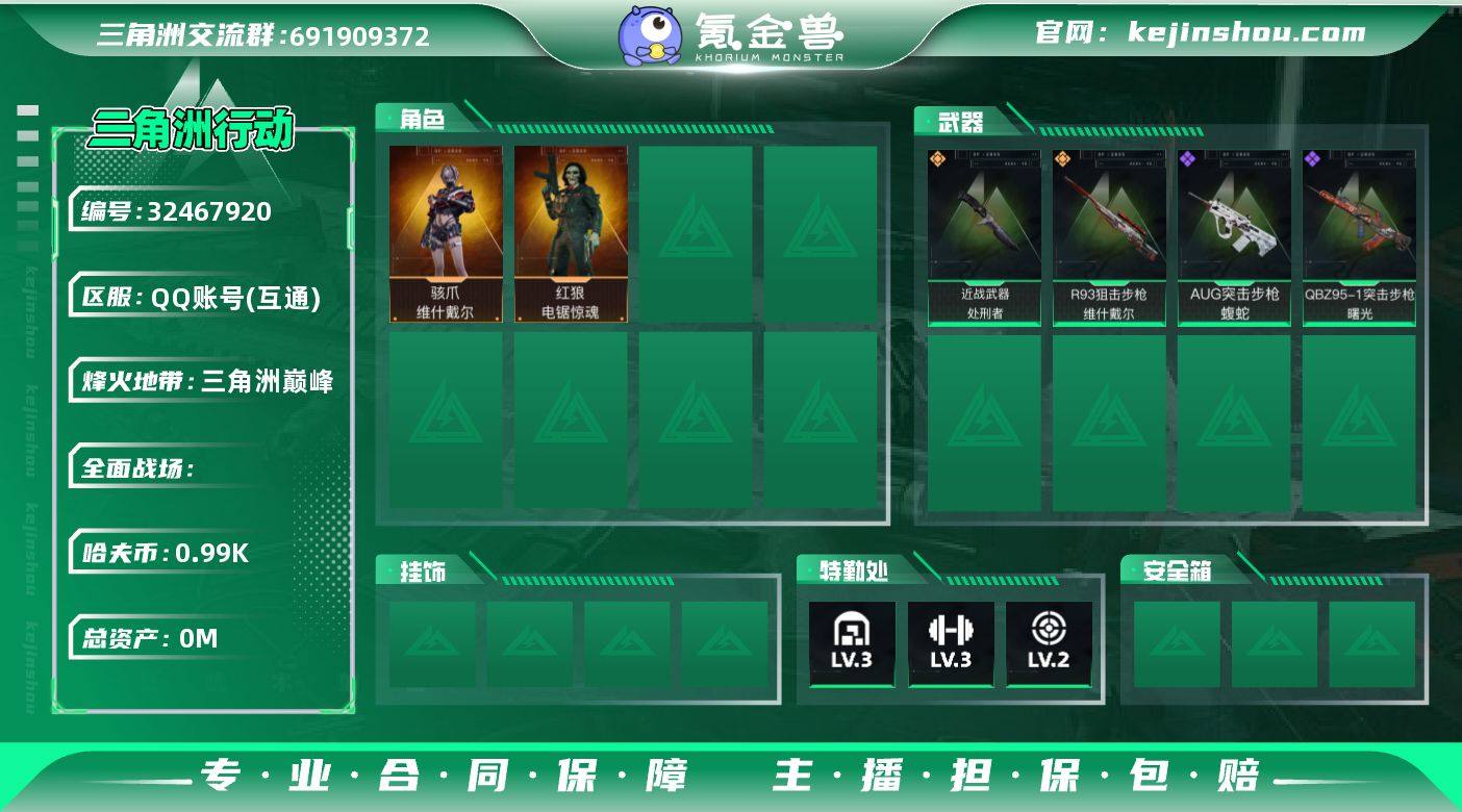 DSX1305【2干员 电锯惊魂 红皮维什戴尔 1刀 处刑者满级】【总资产(M)】10.65【哈夫币】992.2【行动等级】60【全面战场等级】25【烽火地带段位】三角洲巅峰【烽火地带段位经验】6,464【全面地带段位】上等兵【全面地带段位经验】708【烽火地带总场次】2,143【全面战场总战局】33【干员皮肤】骇爪-维什戴尔 红狼-电锯惊魂【近战武器】黑鹰 处刑者【枪皮】AS Val突击步枪-猛兽 AUG突击步枪-猛兽 M7战斗步枪-噬菌体 QBZ95-1突击步枪-花岗岩 K437突击步枪-巨兽 SCAR-H战斗步枪-旧梦 M4A1突击步枪-粉色涂装 M4A1突击步枪-高雅黑 M4A1突击步枪-海色 M4A1突击步枪-零点 AKM突击步枪-肃杀 QBZ95-1突击步枪-高雅黑 QBZ95-1突击步枪-海浪 QBZ95-1突击步枪-海色 QBZ95-1突击步枪-2026 QBZ95-1突击步枪-公平竞技 QBZ95-1突击步枪-曙光 AKS-74U突击步枪-冰天雪地 ASh-12战斗步枪-鹅鸭杀 K416突击步枪-几何迷彩 K416突击步枪-碳纤维 K416突击步枪-一帆风顺 K416突击步枪-阿萨拉特攻 K416突击步枪-冬日风情 M16A4突击步枪-高雅黑 AUG突击步枪-浅蓝涂装 AUG突击步枪-蝮蛇 AUG突击步枪-悠然茶歇 M7战斗步枪-红色涂装 M7战斗步枪-黑巧甜心 M7战斗步枪-前沿科技 M7战斗步枪-捣蛋鬼 SG552突击步枪-...