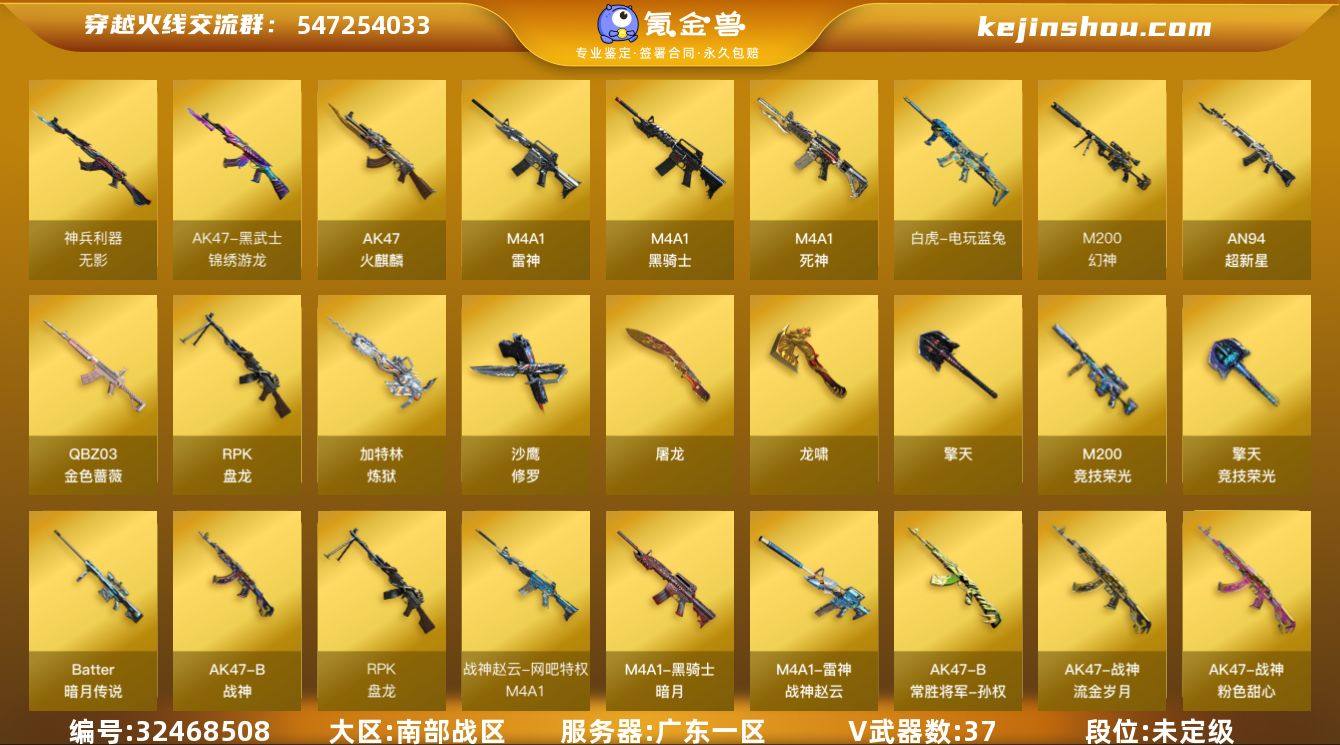 广东一区-44V-3王者武器数-0炫金武器数 【热门武器】:QBZ03-金色蔷薇,M200-幻神,M200-竞技荣光,白虎-电玩蓝兔,M4A1-黑骑士,RPK-盘龙*6,加特林-炼狱,沙鹰-修罗*5 【皮肤】:幻神-冠军之幻,幻神-巅峰荣耀,幻神-纸灯龙皮肤,QBZ03-冠军之薇,金色蔷薇-纸灯龙皮肤,雷神-荣耀之魄,M4A1-战神赵云,雷神-脉冲核心,雷神-宇航兔皮肤,火麒麟-平天大圣,火麒麟-百城,毁灭-黑大圣皮肤,黑骑士-暗月,战神-粉色甜心皮肤,战神-流金岁月皮肤,AK47-B-常胜将军-孙权,炼狱-玩具枪皮肤,屠龙-荣耀之锋,龙啸-冠军之啸,龙啸-纸灯龙皮肤,麒麟刺-甜蜜糖果 皮肤 【角色】:魅影,沙漠玫瑰,司雨,乔伊教练,云海玲珑,暗夜-X,初恋灵狐,芳心审判者,风暴女*2,嘉年华灵狐,灵动武士,灵狐者-七夕宝贝,曼陀罗-礼服,潘多拉-X,斯沃特-X,甜心偶像,兔囡囡,雪莉杨-摸金校尉 【人偶武器】:AWM-灵狐-15周年嘉年华,夺魂,迷你牛牛,迷你生化手雷,生化手雷-机甲核心,Barrett-夜玫瑰,迷你超能女侍 【暴走生化】:超级对讲机 【挑战大师】:冰龙粉碎者-白马银枪*2 【英雄级武器】:AK47-火麒麟,M4A1-雷神,M4A1-黑骑士,M4A1-死神,AN94-超新星,无影-神兵利器,黑武士-锦绣游龙...