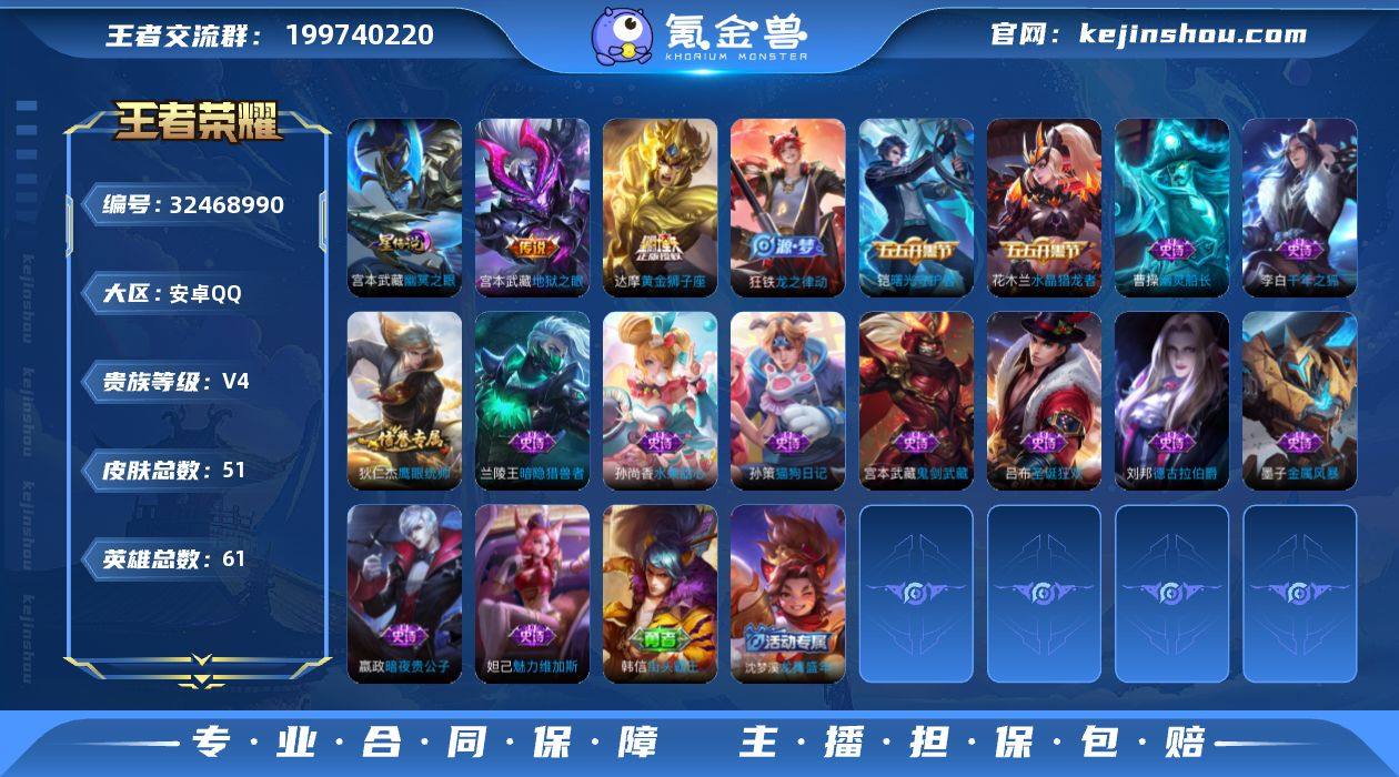 强王者-V4-61英雄-51皮肤-3传说-1星元 17史诗 【稀有英雄】 嬴政 不知火舞 橘右京 娜可露露 韩信 【传说皮肤】 诗剑行 地狱之眼 黄金狮子座 【限定皮肤】 地狱之眼 无心 【史诗皮肤】 德古拉伯爵 无心 鬼剑武藏 龙之律动 魅力维加斯 暗夜贵公子 鹰眼统帅 金属风暴 猫狗日记 梁祝 水晶猎龙者 圣诞狂欢 千年之狐 曙光守护者 水果甜心 幽灵船长 暗隐猎兽者 【勇者皮肤】 时空谍影 龙舞盛年 阴阳师 鲨炮海盗猫 海滩派对 阿尔法小队 死亡骑士 敏锐之力 玩偶对对碰 龙腾万里 教廷特使 街头霸王 幻想奇妙夜 【其他皮肤】 未来旅行 战争女神