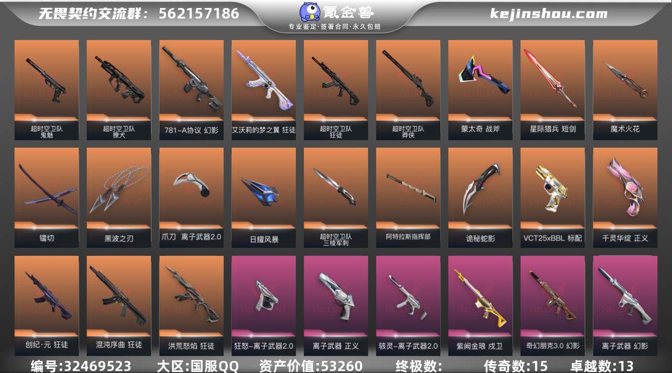 刀:黑波,镭切,超时空(三棱),魔术火花(蝴蝶刀),离子爪刀 ak:流脓,离子,狮子,混沌,朋克,紫金,猫猫,超时空,创纪元 m4:朋克,781协议,离子 正义:离子,莲花 鬼魅,獠犬,莽侠:超时空 狂怒,战神,骇灵:离子 奥丁,戍卫:紫金 冥狙:弃王 标配:VCT
