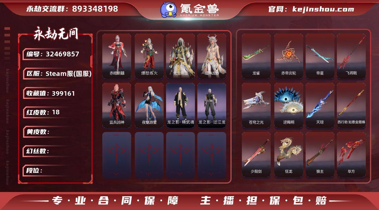 YJJ1927/steam/可换绑/等级457/s19三人无间修罗/18红690金收藏值399161/赤皓新囍/化生明王/熛怒炼火/泣珠龙纱/监兵凶神/夜魅游莹/苍穹之光/毕方/赤帝炎轮/少阳剑/帝星/龙雀/狼主/飞将戟/西行劫·如意金箍棒/天琼/逆晦朔/狂龙/2674·原型/2674·初代机/黑猫警长·警长现身/珥冰/葫芦兄弟·三娃葫芦/大耳狗·泡泡机/甜夜安眠·月安/观山海·春木/御翔云/龙之影·精武魂/璃光·洛天依·音愈律阶/洛天依·音愈律阶/璃光·洛天依·共鸣/洛天依·共鸣/凯蒂猫·魔杖/龙之影·过江龙/金人佣/荆魂/拳皇·勾玉/封神录·赤莲/夜蔷薇/葫芦兄弟·宝葫芦/噬骨/镇冥司/夏日派对·好椰/龙之道·灵心/幻丝227935/未绑定手游