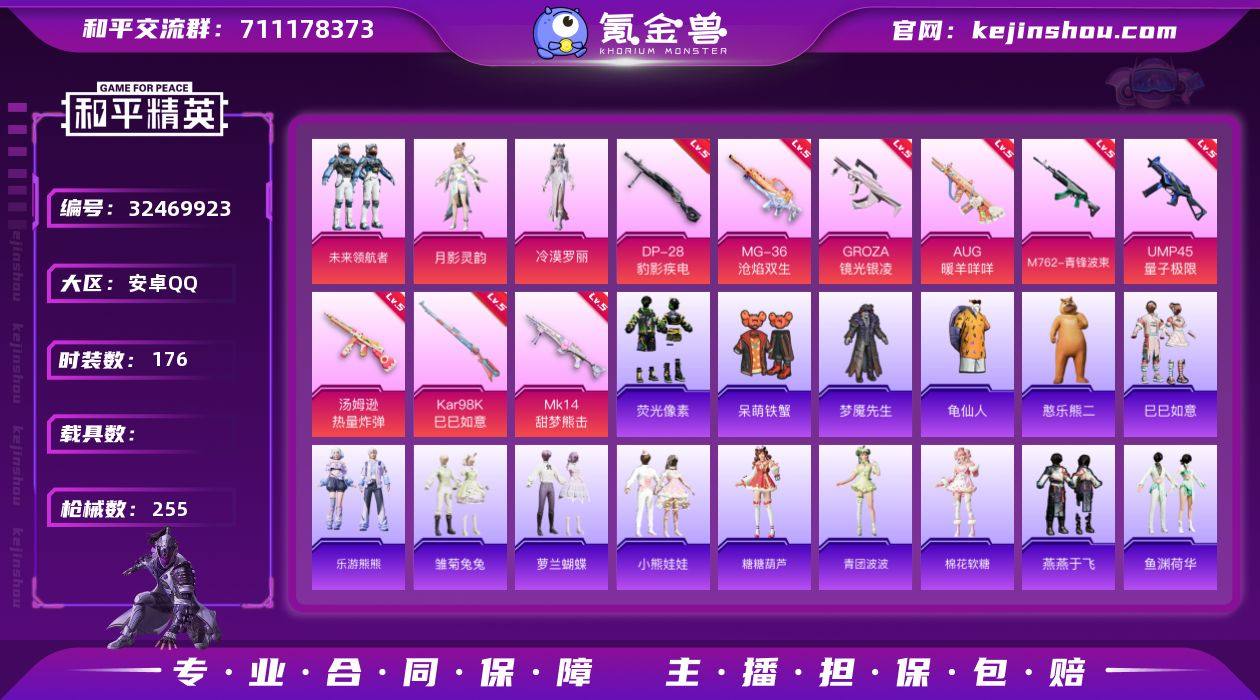 苹果 手Q-4粉装-9特效枪-0载具-5粉色飞行器-64641热力值-10王牌印记-138套装-226枪皮 【热门品类】:套装-浪漫天命,角色-军刀雅典娜,套装-龟仙人,套装-暗影哥特,套装-粉红小猪 【粉色套装】:角色-复仇流浪者,粉装-蜜语绒猫,角色-烟云彩露,粉装-星穹咏叹调 【粉色枪皮等级】:AKM-绿萝繁花(五级),SCAR-L-锦绣绵绵(五级),M416-电玩时刻(五级),Vector-环太平洋(六级),Kar98K-巳巳如意(五级),莫辛纳甘-未来领航者(五级),AMR-智耀战神(六级),SPAS-12-蜜语绒猫(五级),DP-28-豹影疾电(五级) 【粉色枪皮】:AKM-绿萝繁花,SCAR-L-锦绣绵绵,M416-电玩时刻,Vector-环太平洋,Kar98K-巳巳如意,莫辛纳甘-未来领航者,AMR-智耀战神,SPAS-12-蜜语绒猫,DP-28-豹影疾电 【粉色飞行器】:镜光幻境飞行翼,绝色倾城飞行器,星空武士飞行器,百变魔方飞行器 【粉色降落伞】:恐龙拽拽降落伞,环太平洋降落伞,翩跹演武降落伞,歌者泠鸢降落伞,萌酷奶龙降落伞,沙丘之主降落伞,蜜语绒猫降落伞,江南烟雨降落伞,星梦奇缘降落伞,千金淑猫降落伞,鬼刀降落伞,智耀战神降落伞,星穹咏叹调降落伞,炫彩糖果降落伞 【稀有套装】:套装-龟仙人,套装-巳巳如意,套装-炫彩糖果,套装-雏菊兔兔,套装-萝兰蝴蝶,套装-糖糖葫芦,套装-青团波波,套装-燕燕于飞,套装-鱼渊荷华,套装-粉恋花,套装-紫幽梦,套装-蓝冰羽,角色-幽澜祭司,角色-鲛海歌灵,套装-星影赞美诗,套装-星渊小夜曲,套装-云朵鹅,套装-雪绒豹,套装-朱霞炽焰,套装-凌霄紫焰,角色-紫俏灵猫 【稀有枪皮】:AUG-冰晶雪宝,AKM-彩虹符号,AKM-恐龙拽拽,AKM-环太平洋,AKM-生命誓言,AKM-破晓战魂,AKM-萌趣颜团子,AKM-虎虎生威,AKM-阿狸红,AKM-霓虹街区,AKM-龙的传人,M16A4-幻世战舞者,M16A4-甜心亚梦,M16A4-蓝色火焰,SCAR-L-是爱神辣,SC...