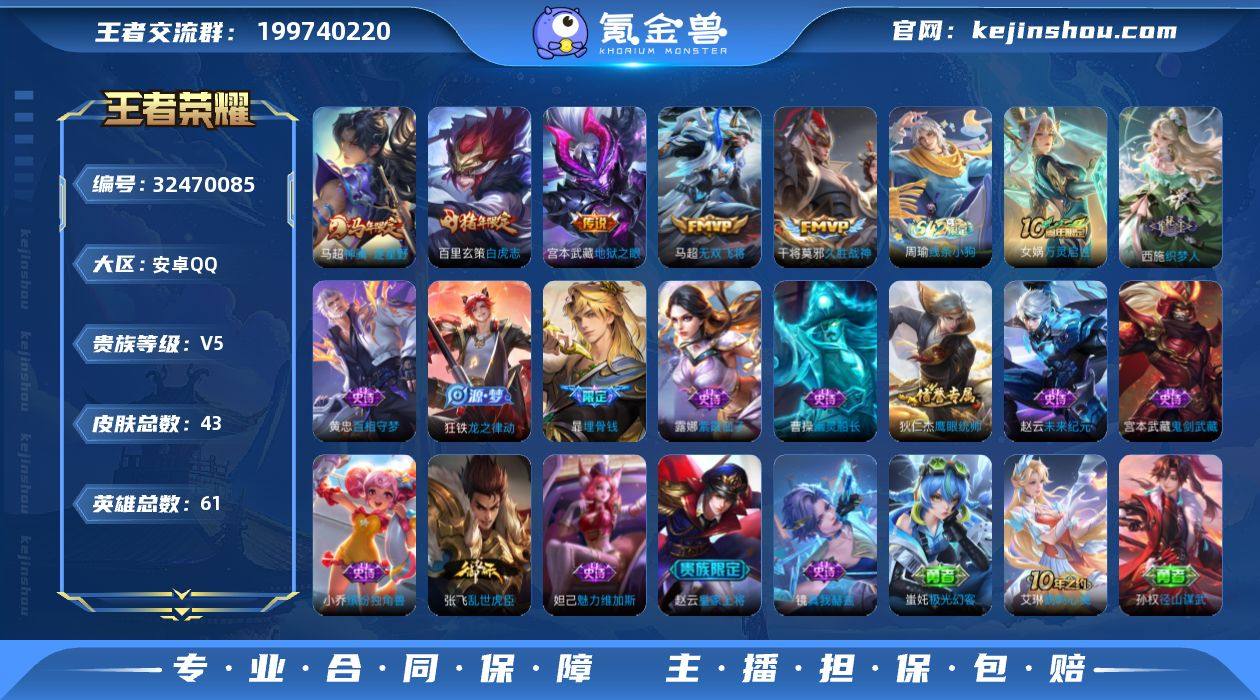 【Hwz752】【精品男号】:安卓Q-V5-还差83v6-1按键-市标马超-61英雄-43皮肤-5传说-15史诗(白虎志、神骥逐星野、无双飞将) 【英雄全皮】:孙权全皮 【传说皮肤】:马超神骥逐星野,马超无双飞将,干将莫邪久胜战神,百里玄策白虎志,宫本武藏地狱之眼 【限定皮肤】:暃埋骨钱,狄仁杰阴阳师,赵云皇家上将,项羽海滩派对,百里玄策白虎志 【年限皮肤】:百里玄策白虎志 【赛季限定】:甄姬逆浪荇歌 【战令限定】:周瑜线条小狗 【史诗皮肤】:周瑜线条小狗,女娲万灵启世,西施织梦人,黄忠百相守梦,狂铁龙之律动,暃埋骨钱,镜真我赫兹,狄仁杰鹰眼统帅,小乔缤纷独角兽,张飞乱世虎臣,曹操幽灵船长,妲己魅力维加斯,宫本武藏鬼剑武藏,赵云未来纪元,赵云皇家上将,露娜紫霞仙子 【其他皮肤】:蚩奼极光幻客,艾琳鹤鸣心笺,孙权径山谋武,哪吒罗小黑战记,鬼谷子克喵,莱西奥踏浪烽翎,甄姬逆浪荇歌,姬小满零食大作战,典韦铁甲之心,苏烈坚韧之力,狄仁杰阴阳师,宫本武藏万象初新,张飞五福同心,亚瑟死亡骑士,白起白色死神,项羽海滩派对,蒙恬秩序猎龙将,镜冰刃幻境,马超幸存者,女娲尼罗河女神,大乔伊势巫女,小乔万圣前夜 【营地ID】:1596904019