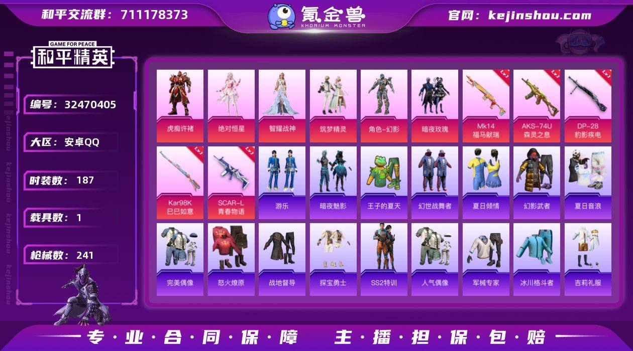 可二次【5粉装5特效枪1载具 可秒换绑不用等】 安卓Q区-73307热力值-187套装-241枪皮 【1载具】 路特斯EV黄色【5粉装】 暗夜玫瑰 筑梦精灵 虎痴许褚 角色-绝对恒星 角色-智耀战神【5特效枪】 SCAR-L-青春物语(7级) Mk14-福马献瑞(4级) AKS-74U-森灵之息(5级) Kar98K-巳巳如意(5级) DP-28-豹影疾电(5级)【41热门】 M416-蓝色火焰 GROZA-异彩先驱 GROZA-蓝莓炮弹 GROZA-彩虹符号 M762-镭射皇者 长空猛禽 异彩先驱 虚音幻奏 甜心亚梦 甜蜜熊情侣 牛气冲天 霓虹街区 霓虹极客 酷萌兔限定 S686-奇异狩猎者 静谧青瓷 破蛋小黄鸡 极速红龙 团圆交子 瑞龙福将 冰川格斗者 缤纷焰火 白色伏地魔 SS22特训 Kar98K-王子的夏天 AWM-不夜海上花 SCAR-L-玉兔迎春 GROZA-恐龙拽拽 Mk47-乌木金纹 UZI-娇憨猪猪 M416-夜灯 UMP45-蓝色火焰 S12K-垂柳戏鸭 DBS-彩虹符号 MG3-幻世战舞者 AKM-虎虎生威 AKM-锦绣火鲤【6飞行器】 粉色滑翔尾迹 红色滑翔尾迹 火焰蝠人飞行服 炫彩糖果飞行器 绝对恒星飞行器 脆鲨七海飞行器 营地ID:745325861