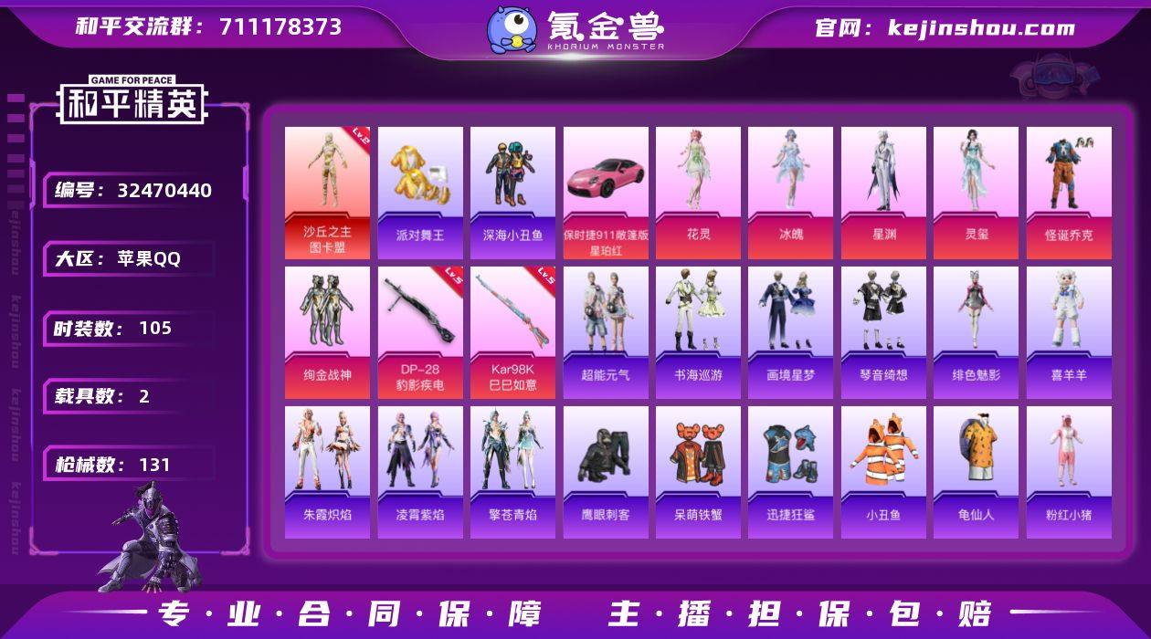 【特价出售/店主推荐】 /绝世印记1 苹果 手Q-1神装-7粉装-6特效枪-2载具-6粉色飞行器-43174热力值-4王牌印记-105套装-131枪皮【红色神装等级】:沙丘之主-图卡盟(二级)【热门品类】:粉装-怪诞乔克,套装-派对舞王,套装-深海小丑鱼,套装-小丑鱼,套装-龟仙人,套装-粉红小猪【粉色套装】:粉装-怪诞乔克,粉装-绚金战神,角色-花灵,角色-冰魄,角色-星渊,角色-灵玺,角色-鸢尾珑雾【粉色枪皮等级】:M416-天马神君(三级),UMP45-萌骑冒险(五级),AKS-74U-森灵之息(五级),Kar98K-巳巳如意(五级),Mk14-福马献瑞(五级),DP-28-豹影疾电(五级)【粉色载具】:保时捷911 敞篷版(星珀红),凌风神骏【粉色枪皮】:M416-天马神君,UMP45-萌骑冒险,AKS-74U-森灵之息,Kar98K-巳巳如意,Mk14-福马献瑞,DP-28-豹影疾电【粉色飞行器】:香车宝马飞行器,炫彩糖果飞行器,沙丘之主天马,无垠阁飞行器,踏卷乘风飞行器