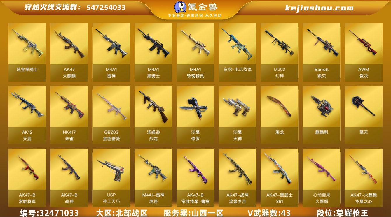 山西一区-45V-1王者-1炫金 【热门武器】:QBZ03-金色蔷薇,HK417-朱雀,M200-幻神,白虎-电玩蓝兔,M4A1-黑骑士,汤姆逊-烈龙*6,沙鹰-修罗*5 【王者炫金武器】:炫金骑士 【音效卡】:AK47-火麒麟音效卡,M4A1-雷神音效卡,Barrett-毁灭音效卡 【皮肤】:幻神-电流骇客 皮肤,雷神-虎将,火麒麟-雷神,火麒麟-华夏之心,火麒麟-心动糖果,毁灭耀金皮肤,毁灭-英雄计划 皮肤,AK47-黑武士-361,战神-流金岁月皮肤,AK47-B-常胜将军-曹操 【角色】:樱,王者-瞳-闭月羞花,王者-魅影,暗夜-X,芳心审判者,嘉年华灵狐,潘多拉-X,潘多拉-甜心教官,斯沃特-X,铁骑荣耀,樱-战斗天使 【人偶武器】:AWM-灵狐-15周年嘉年华,迷你波特博士,迷你超能女侍 【挑战大师】:AK47-冰龙粉碎者,激光毁灭者III 【英雄级武器】:AK47-火麒麟,M4A1-雷神,M4A1-黑骑士,AK12-天启,HK417-朱雀,M4A1-玫瑰精灵,QBZ03-金色蔷薇,AK47-B-战神,AK47-B-常胜将军,白虎-电玩蓝兔,Barrett-毁灭,AWM-裁决,M200-幻神,汤姆逊-烈龙*6,沙鹰-修罗*5,沙鹰-天神,USP-神工天巧,屠龙,擎天,麒麟刺,高爆手雷-幻灵,高爆手雷-竞技荣光,高爆手雷-云龙,闪光弹-幻灵,闪光弹-竞技荣光,闪光弹-神工...