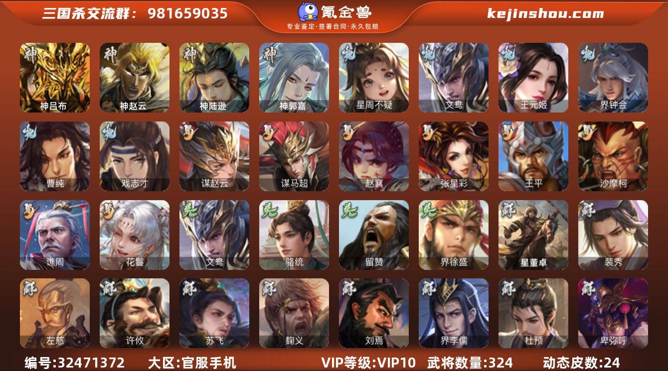 【2421】官阶:大将军;VIP等级:VIP10;史诗武将数量:33;动态皮肤数量:24;武将总数:324;史诗宝珠数量:13;将魂数量:7427;神将:4;魏国史诗武将:16;蜀国史诗武将:8;吴国史诗武将:3;群史诗武将:13